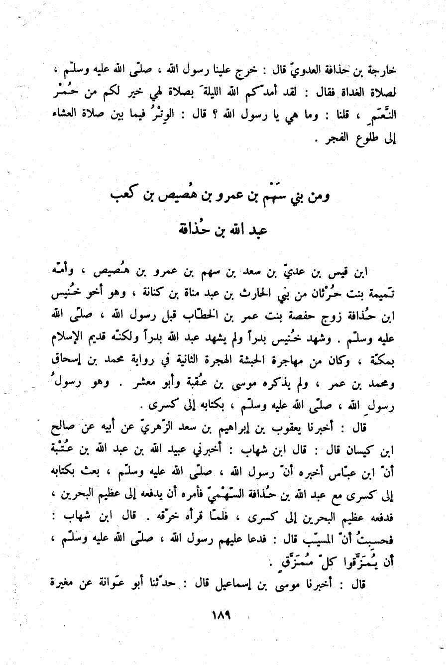 قَالَ: أَخْبَرَنَا يَعْقُوبُ بْنُ إِبْرَاهِيمَ بْنِ سَعْدٍ الزُّهْرِيُّ، عَنْ أَبِيهِ، عَنْ صَالِحِ بْنِ كَيْسَانَ قَالَ: قَالَ ابْنُ شِهَابٍ: أَخْبَرَنِي عُبَيْدُ اللَّهِ بْنُ عَبْدِ اللَّهِ بْنِ عُتْبَةَ، أَنَّ ابْنَ عَبَّاسٍ أَخْبَرَهُ أَنَّ رَسُولَ اللَّهِ صلّى الله عليه وسلم §بَعَثَ بِكِتَابِهِ إِلَى كِسْرَى مَعَ عَبْدِ اللَّهِ بْنِ حُذَافَةَ السَّهْمِيِّ , فَأَمَرَهُ أَنْ يَدْفَعَهُ إِلَى عَظِيمِ الْبَحْرَيْنِ، فَدَفَعَهُ عَظِيمُ الْبَحْرَيْنِ إِلَى كِسْرَى , فَلَمَّا قَرَأَهُ خَرَقَهُ، قَالَ ابْنُ شِهَابٍ: فَحَسِبْتُ أَنَّ الْمُسَيِّبَ قَالَ: فَدَعَا عَلَيْهِمْ رَسُولُ اللَّهِ صلّى الله عليه وسلم أَنْ يُمَزَّقُوا كُلَّ مُمَزَّقٍ