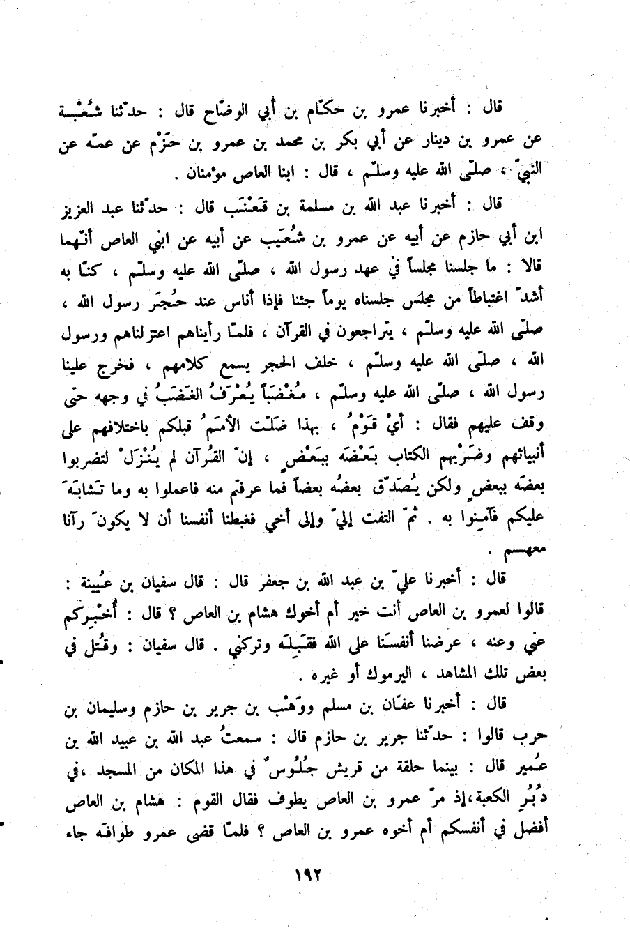 قَالَ: أَخْبَرَنَا عَبْدُ اللَّهِ بْنُ مَسْلَمَةَ بْنِ قَعْنَبٍ قَالَ: حَدَّثَنَا عَبْدُ الْعَزِيزِ بْنُ أَبِي حَازِمٍ، عَنْ أَبِيهِ، عَنْ عَمْرِو بْنِ شُعَيْبٍ، عَنْ أَبِيهِ، عَنِ ابْنَيِ الْعَاصِ أَنَّهُمَا قَالَا: مَا جَلَسْنَا مَجْلِسًا فِي عَهْدِ رَسُولِ اللَّهِ صلّى الله عليه وسلم كُنَّا بِهِ أَشَدَّ اغْتِبَاطًا مِنْ مَجْلِسٍ جَلَسْنَاهُ، يَوْمًا جِئْنَا فَإِذَا أُنَاسٌ عِنْدَ حُجَرِ رَسُولِ اللَّهِ صلّى الله عليه وسلم يَتَرَاجَعُونَ فِي الْقُرْآنِ , فَلَمَّا رَأَيْنَاهُمُ اعْتَزَلْنَاهُمْ وَرَسُولُ اللَّهِ صلّى الله عليه وسلم خَلْفَ الْحُجَرِ يَسْمَعُ كَلَامَهُمْ، فَخَرَجَ عَلَيْنَا رَسُولُ اللَّهِ صلّى الله عليه وسلم مُغْضَبًا يُعْرَفُ الْغَضَبُ فِي وَجْهِهِ حَتَّى وَقَفَ عَلَيْهِمْ فَقَالَ: «أَيْ قَوْمِ، بِهَذَا §ضَلَّتِ الْأُمَمُ قَبْلَكُمْ بِاخْتِلَافِهِمْ عَلَى أَنْبِيَائِهِمْ وَضَرْبِهِمُ الْكِتَابَ بَعْضَهُ بِبَعْضٍ، إِنَّ الْقُرْآنَ لَمْ يَنْزِلْ لِتَضْرِبُوا بَعْضَهُ بِبَعْضٍ وَلَكِنْ يُصَدِّقِ بَعْضُهُ بَعْضًا، فَمَا عَرَفْتُمْ مِنْهُ فَاعْمَلُوا بِهِ، وَمَا تَشَابَهَ عَلَيْكُمْ فَآمِنُوا بِهِ» ، ثُمَّ الْتَفَتَ إِلَيَّ وَإِلَى أَخِي فَغَبَطْنَا أَنْفُسَنَا أَنْ لَا يَكُونَ رَآنَا مَعَهُمْ