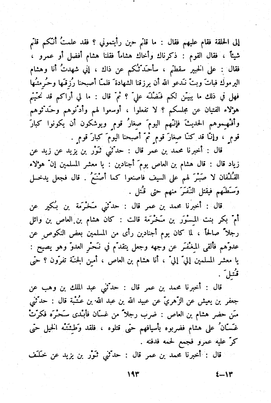 قَالَ: أَخْبَرَنَا مُحَمَّدُ بْنُ عُمَرَ قَالَ: حَدَّثَنِي ثَوْرُ بْنُ يَزِيدَ، عَنْ زَيْدٍ، عَنْ زِيَادٍ قَالَ: قَالَ هِشَامُ بْنُ الْعَاصِ يَوْمَ أَجْنَادِينَ: يَا مَعْشَرَ الْمُسْلِمِينَ إِنَّ هَؤُلَاءِ §الْقُلْفَانِ لَا صَبَرَ لَهُمْ عَلَى السَّيْفِ , فَاصْنَعُوا كَمَا أَصْنَعُ. قَالَ: فَجَعَلَ يَدْخُلُ وَسْطَهُمْ , فَيَقْتُلُ النَّفَرَ مِنْهُمْ حَتَّى قُتِلَ