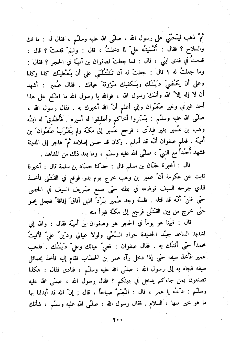 قَالَ: أَخْبَرَنَا عَفَّانُ بْنُ مُسْلِمٍ قَالَ: حَدَّثَنَا حَمَّادُ بْنُ سَلَمَةَ قَالَ: أَخْبَرَنَا ثَابِتٌ، عَنْ عِكْرِمَةَ أَنَّ عُمَيْرَ بْنَ وَهْبٍ خَرَجَ يَوْمَ بَدْرٍ , فَوَقَعَ فِي الْقَتْلَى , فَأَخَذَ الَّذِي جَرَحَهُ السَّيْفَ , فَوَضَعَهُ فِي بَطْنِهِ حَتَّى سَمِعَ صَرِيفَ السَّيْفِ فِي الْحَصَى حَتَّى ظَنَّ أَنَّهُ قَدْ قَتَلَهُ، فَلَمَّا وَجَدَ عُمَيْرٌ بَرْدَ اللَّيْلِ أَفَاقَ إِفَاقَةً , فَجَعَلَ يَحْبُو حَتَّى خَرَجَ مِنْ بَيْنِ الْقَتْلَى , فَرَجَعَ إِلَى مَكَّةَ , فَبَرِئَ مِنْهُ , قَالَ: فَبَيْنَا هُوَ يَوْمًا فِي الْحِجْرِ هُوَ وَصَفْوَانُ بْنُ أُمَيَّةَ , فَقَالَ: وَاللَّهِ إِنِّي لَشَدِيدُ السَّاعِدِ جَيِّدُ الْحَدَيدَةِ جَوَادُ السَّعْيِ، وَلَوْلَا عِيَالِي وَدَيْنٌ عَلَيَّ لَأَتَيْتُ مُحَمَّدًا حَتَّى أَفْتِكَ بِهِ، فَقَالَ: صَفْوَانُ: فَعَلَيَّ عِيَالُكَ وَعَلَيَّ دَيْنُكَ، فَذَهَبَ عُمَيْرٌ , فَأَخَذَ سَيْفَهُ، حَتَّى إِذَا دَخَلَ رَآهُ عُمَرُ بْنُ الْخَطَّابِ , فَقَامَ إِلَيْهِ , فَأَخَذَ بِحَمَائِلِ سَيْفِهِ , فَجَاءَ بِهِ إِلَى رَسُولِ اللَّهِ صلّى الله عليه وسلم , فَنَادَى , فَقَالَ: هَكَذَا تَصْنَعُونَ بِمَنْ جَاءَكُمْ يَدْخُلُ فِي دِينِكُمْ؟ فَقَالَ رَسُولُ اللَّهِ صلّى الله عليه وسلم: «§دَعْهُ يَا عُمَرُ» ، قَالَ: أَنْعِمْ صَبَاحًا، قَالَ: «إِنَّ اللَّهَ قَدْ أَبْدَلْنَا بِهَا مَا هُوَ خَيْرٌ مِنْهَا، السَّلَامُ» ، فَقَالَ رَسُولُ اللَّهِ صلّى الله عليه وسلم: «شَأْنَكَ