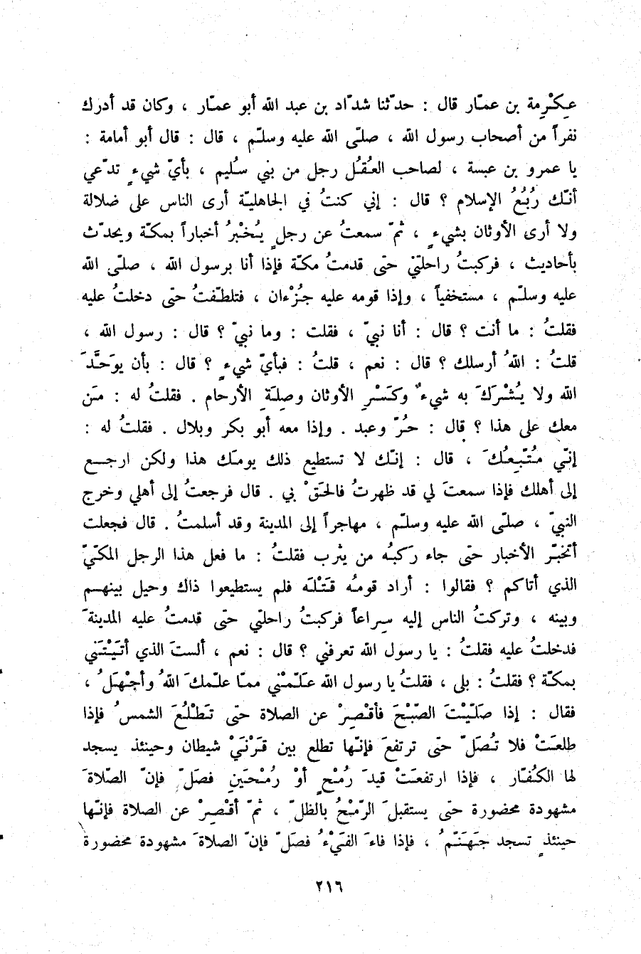 عِكْرِمَةُ بْنُ عَمَّارٍ قَالَ: حَدَّثَنَا شَدَّادُ بْنُ عَبْدِ اللَّهِ أَبُو عَمَّارٍ، وَكَانَ قَدْ أَدْرَكَ نَفَرًا مِنْ أَصْحَابِ رَسُولِ اللَّهِ صلّى الله عليه وسلم قَالَ: قَالَ أَبُو أُمَامَةَ: يَا عَمْرُو بْنَ عَبَسَةَ لِصَاحِبِ الْعُقُلِ رَجُلٌ مِنْ بَنِي سُلَيْمٍ بِأَيِّ شَيْءٍ تَدَّعِي أَنَّكَ رُبُعُ الْإِسْلَامِ؟ قَالَ: إِنِّي كُنْتُ فِي الْجَاهِلِيَّةِ أَرَى النَّاسَ عَلَى ضَلَالَةٍ وَلَا أَرَى الْأَوْثَانَ بِشَيْءٍ، ثُمَّ سَمِعْتُ عَنَ رَجُلٍ يُخْبِرُ أَخْبَارًا بِمَكَّةَ، وَيُحَدِّثُ بِأَحَادِيثَ , فَرَكِبْتُ رَاحِلَتِي حَتَّى قَدِمْتُ مَكَّةَ، فَإِذَا أَنَا بِرَسُولِ اللَّهِ صلّى الله عليه وسلم مُسْتَخْفِيًا وَإِذَا قَوْمُهُ عَلَيْهِ جُزْءَانِ، فَتَلَطَّفْتُ حَتَّى دَخَلْتُ عَلَيْهِ , فَقُلْتُ: مَا أَنْتَ؟ قَالَ: «§أَنَا نَبِيُّ» ، فَقُلْتُ: وَمَا نَبِيُّ؟ قَالَ: «رَسُولُ اللَّهِ» ، قُلْتُ: اللَّهُ أَرْسَلَكَ؟، قَالَ: «نَعَمْ» ، قُلْتُ: فَبِأَيِّ شَيْءٍ؟، قَالَ: «بِأَنْ يُوَحَّدَ اللَّهُ، وَلَا يُشْرَكَ بِهِ شَيْءٌ، وَكَسْرِ الْأَوْثَانِ وَصِلَةِ الْأَرْحَامِ» ، فَقُلْتُ لَهُ: مَنْ مَعَكَ عَلَى هَذَا؟، قَالَ: «حُرٌّ وَعَبْدٌ» ، وَإِذَا مَعَهُ أَبُو بَكْرٍ , وَبِلَالٌ، فَقُلْتُ لَهُ: إِنِّي مُتَّبِعُكَ، قَالَ: «إِنَّكَ لَا تَسْتَطِيعُ ذَلِكَ يَوْمَكَ هَذَا، وَلَكِنِ ارْجِعْ إِلَى أَهْلِكِ , فَإِذَا سَمِعْتَ لِيَ قَدْ ظَهَرْتُ , فَالْحَقْ بِي» ، قَالَ: فَرَجَعْتُ إِلَى أَهْلِي وَخَرَجَ النَّبِيُّ صلّى الله عليه وسلم مُهَاجِرًا إِلَى الْمَدِينَةِ وَقَدْ أَسْلَمْتُ، قَالَ: فَجَعَلْتُ أَتَخَبَّرُ الْأَخْبَارَ حَتَّى جَاءَ رَكْبُهُ مِنْ يَثْرِبَ، فَقُلْتُ: مَا فَعَلَ هَذَا الرَّجُلُ الْمَكِّيُّ الَّذِي أَتَاكُمْ؟، فَقَالُوا: أَرَادَ قَوْمُهُ قَتْلَهُ , فَلَمْ يَسْتَطِيعُوا ذَاكَ، وَحِيلَ بَيْنَهُمْ وَبَيْنَهُ، وَتَرَكْتُ النَّاسَ إِلَيْهِ سِرَاعًا , فَرَكِبْتُ رَاحِلَتِي حَتَّى قَدِمْتُ عَلَيْهِ الْمَدِينَةَ , فَدَخَلْتُ عَلَيْهِ , فَقُلْتُ: يَا رَسُولَ اللَّهِ تَعْرِفُنِي؟، قَالَ: «نَعَمْ، أَلَسْتَ الَّذِي أَتَيْتَنِي بِمَكَّةَ» ؟، فَقُلْتُ: بَلَى، فَقُلْتُ: يَا رَسُولَ اللَّهِ عَلِّمْنِي مِمَّا عَلَّمَكَ اللَّهُ وَأَجْهَلُ، فَقَالَ: «إِذَا صَلَّيْتَ الصُّبْحَ , فَأَقْصِرْ عَنِ الصَّلَاةِ حَتَّى تَطْلُعَ الشَّمْسُ، فَإِذَا طَلَعَتْ فَلَا تُصَلِّ حَتَّى تَرْتَفِعَ، فَإِنَّهَا تَطْلُعُ بَيْنَ قَرْنَيْ شَيْطَانٍ وَحِينَئِذٍ يَسْجُدُ لَهَا الْكُفَّارُ، فَإِذَا ارْتَفَعَتْ قَيْدَ رُمْحٍ أَوْ رُمْحَيْنِ فَصَلِّ , فَإِنَّ الصَّلَاةَ مَشْهُوَدَةٌ مَحْضُورَةٌ حَتَّى يُسْتَقْبَلَ الرُّمْحُ بِالظِّلِّ، ثُمَّ أَقْصِرْ عَنِ الصَّلَاةِ , فَإِنَّهَا حِينَئِذٍ تَسْجُدُ جَهَنَّمُ، فَإِذَا فَاءَ الْفَيْءُ , فَصَلِّ فَإِنَّ الصَّلَاةَ مَشْهُوَدَةٌ مَحْضُورَةٌ