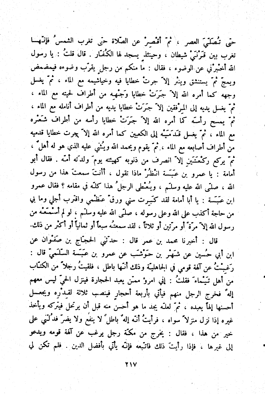 حَتَّى تُصَلِّيَ الْعَصْرَ، ثُمَّ أَقْصِرْ عَنِ الصَّلَاةِ حَتَّى تَغْرُبَ الشَّمْسُ , فَإِنَّهَا تَغْرُبُ بَيْنَ قَرْنَيْ شَيْطَانٍ وَحِينَئِذٍ يَسْجُدُ لَهَا الْكُفَّارُ» ، قَالَ: قُلْتُ: يَا رَسُولَ اللَّهِ أَخْبَرَنِي عَنِ الْوُضُوءِ، فَقَالَ: «مَا مِنْكُمْ مِنْ رَجُلٍ يُقَرِّبُ وضُوءَهُ فَيُمَضْمِضُ وَيَمُجُّ، ثُمَّ يَسْتَنْشِقُ وَيَنْثُرُ إِلَّا جَرَتْ خَطَايَا فِيهِ وَخَيَاشِيمِهِ مَعَ الْمَاءِ، ثُمَّ يَغْسِلُ وَجْهَهُ كَمَا أَمَرَهُ اللَّهُ إِلَّا جَرَتْ خَطَايَا وَجْهِهِ مِنْ أَطْرَافِ لِحْيَتِهِ مَعَ الْمَاءِ، ثُمَّ يَغْسِلُ يَدَيْهِ إِلَى الْمِرْفَقَيْنِ إِلَّا جَرَتْ خَطَايَا يَدَيْهِ مِنْ أَطْرَافِ أَنَامِلِهِ مَعَ الْمَاءِ، ثُمَّ يَمْسَحُ رَأْسَهُ كَمَا أَمَرَهُ اللَّهُ إِلَّا جَرَتْ خَطَايَا رَأْسِهِ مِنْ أَطْرَافِ شَعْرِهِ مَعَ الْمَاءِ، ثُمَّ يَغْسِلُ قَدَمَيْهِ إِلَى الْكَعْبَيْنِ كَمَا أَمَرَهُ اللَّهُ إِلَّا جَرَتْ خَطَايَا قَدَمَيْهِ مِنْ أَطْرَافِ أَصَابِعِهِ مَعَ الْمَاءِ، ثُمَّ يَقُومُ وَيَحْمَدُ اللَّهَ وَيُثْنِي عَلَيْهِ الَّذِي هُوَ لَهُ أَهْلٌ، ثُمَّ يَرْكَعُ رَكْعَتَيْنِ إِلَّا انْصَرَفَ مِنْ ذُنُوبِهِ كَهَيْئَتِهِ يَوْمَ وَلَدَتْهُ أُمُّهُ» فَقَالَ أَبُو أُمَامَةَ: يَا عَمْرُو بْنُ عَبَسَةَ انْظُرْ مَاذَا تَقُولُ: أَأَنْتَ سَمِعْتَ هَذَا مِنْ رَسُولِ اللَّهِ صلّى الله عليه وسلم وَيُعْطَى الرَّجُلُ هَذَا كُلَّهُ فِي مَقَامِهِ؟، فَقَالَ عَمْرُو بْنُ عَبَسَةَ: يَا أَبَا أُمَامَةَ لَقَدْ كَبُرَتْ سِنِّي وَرِقَ عَظْمِي وَاقْتَرَبَ أَجَلِي، وَمَا بِي مِنْ حَاجَةٍ أَكْذِبُ عَلَى اللَّهِ وَعَلَى رَسُولِهِ صلّى الله عليه وسلم، لَوْ لَمْ أَسْمَعْهُ مِنْ رَسُولِ اللَّهِ إِلَّا مَرَّةً أَوْ مَرَّتَيْنِ أَوْ ثَلَاثًا، لَقَدْ سَمِعْتُهُ سَبْعًا أَوْ ثَمَانِيًا أَوْ أَكْثَرَ مِنْ ذَلِكَ