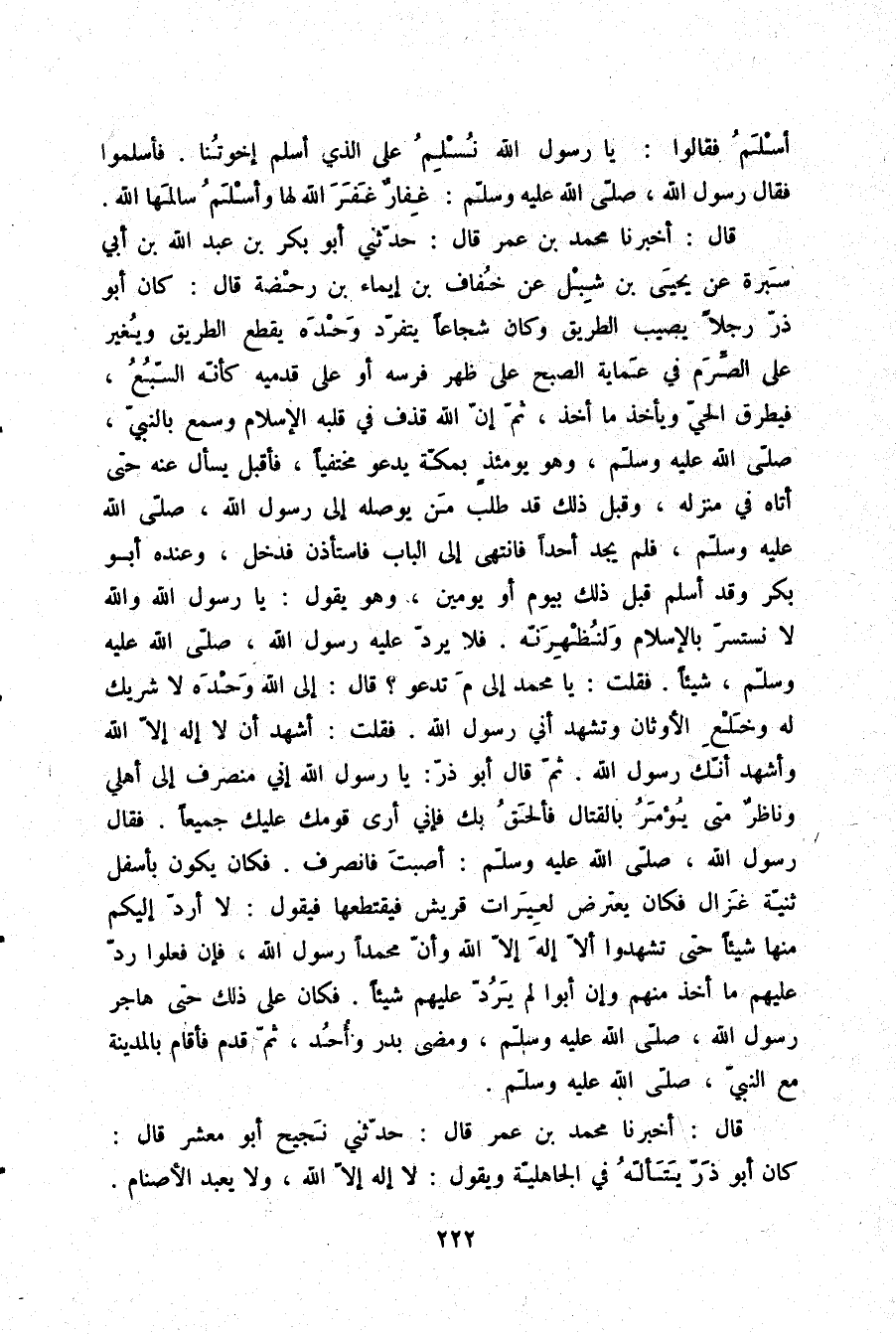 قَالَ: أَخْبَرَنَا مُحَمَّدُ بْنُ عُمَرَ قَالَ: حَدَّثَنِي أَبُو بَكْرِ بْنُ عَبْدِ اللَّهِ بْنِ أَبِي سَبْرَةَ، عَنْ يَحْيَى بْنِ شِبْلٍ، عَنْ خُفَافِ بْنِ إِيمَاءِ بْنِ رَحَضَةَ قَالَ: كَانَ أَبُو ذَرٍّ رَجُلًا يُصِيبُ الطَّرِيقَ , وَكَانَ شُجَاعًا يَتَفَرَّدُ وَحْدَهُ يَقْطَعُ الطَّرِيقَ وَيُغِيرُ عَلَى الصِّرَمِ فِي عَمَايَةِ الصُّبْحِ عَلَى ظَهْرَ فَرَسِهِ أَوْ عَلَى قَدَمَيْهِ كَأَنَّهُ السَّبْعُ فَيَطْرُقُ الْحَيَّ وَيَأْخُذُ مَا أَخَذَ، ثُمَّ إِنَّ اللَّهَ قَذَفَ فِي قَلْبِهِ الْإِسْلَامَ وَسَمِعَ بِالنَّبِيَّ صلّى الله عليه وسلم وَهُوَ يَوْمَئِذٍ بِمَكَّةَ يَدْعُو مُخْتَفِيًا، فَأَقْبَلَ يَسْأَلُ عَنْهُ حَتَّى أَتَاهُ فِي مَنْزِلِهِ , وَقَبْلَ ذَلِكَ قَدْ طَلَبَ مَنْ يُوَصِّلُهِ إِلَى رَسُولِ اللَّهِ صلّى الله عليه وسلم , فَلَمْ يَجِدْ أَحَدًا , فَانْتَهَى إِلَى الْبَابِ , فَاسْتَأْذَنَ , فَدَخَلَ وَعِنْدَهُ أَبُو بَكْرٍ وَقَدْ أَسْلَمْ قَبْلَ ذَلِكَ بِيَوْمٍ أَوْ يَوْمَيْنِ , وَهُوَ يَقُولُ: يَا رَسُولَ اللَّهِ وَاللَّهِ لَا نَسْتَسِرُّ بِالْإِسْلَامِ وَلَنُظْهِرَنَّهُ، فَلَا يَرُدُّ عَلَيْهِ رَسُولُ اللَّهِ صلّى الله عليه وسلم شَيْئًا، فَقُلْتُ يَا مُحَمَّدُ: إِلَامَ تَدْعُو؟، قَالَ: «إِلَى اللَّهِ §وَحْدَهُ لَا شَرِيكَ لَهُ وَخَلْعِ الْأَوْثَانِ وَتَشْهَدُ أَنِّي رَسُولُ اللَّهِ» ، فَقُلْتُ: أَشْهَدُ أَنْ لَا إِلَهَ إِلَّا اللَّهُ وَأَشْهَدُ أَنَّكَ رَسُولُ اللَّهِ، ثُمَّ قَالَ أَبُو ذَرٍّ: يَا رَسُولَ اللَّهِ إِنِّي مُنْصَرِفٌ إِلَى أَهْلِي وَنَاظِرٌ مَتَى يُؤْمَرُ بِالْقِتَالِ فَأَلْحَقَ بِكَ، فَإِنِّي أَرَى قَوْمَكَ عَلَيْكَ جَمِيعًا، فَقَالَ رَسُولُ اللَّهِ صلّى الله عليه وسلم: «أَصَبْتَ» ، فَانْصَرَفَ , فَكَانَ يَكُونُ بِأَسْفَلِ ثَنِيَّةِ غَزَالٍ , فَكَانَ يَعْتَرِضُ لِعِيرَاتِ قُرَيْشٍ , فَيَقْتَطِعُهَا، فَيَقُولُ: لَا أَرُدُّ إِلَيْكُمْ مِنْهَا شَيْئًا حَتَّى تَشْهَدُوا أَلَا إِلَهَ إِلَّا اللَّهُ وَأَنَّ مُحَمَّدًا رَسُولُ اللَّهِ، فَإِنْ فَعَلُوا رَدَّ عَلَيْهِمْ مَا أَخَذَ مِنْهُمْ، وَإِنْ أَبَوْا لَمْ يَرُدَّ عَلَيْهِمْ شَيْئًا، فَكَانَ عَلَى ذَلِكَ حَتَّى هَاجَرَ رَسُولُ اللَّهِ صلّى الله عليه وسلم وَمَضَى بَدْرٌ وَأَحَدٌ، ثُمَّ قَدِمَ , فَأَقَامَ بِالْمَدِينَةِ مَعَ النَّبِيِّ صلّى الله عليه وسلم