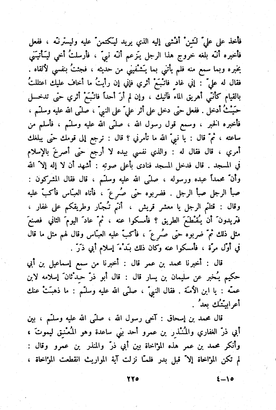 قَالَ: أَخْبَرَنَا مُحَمَّدُ بْنُ عُمَرَ قَالَ: أَخْبَرَنَا مَنْ سَمِعَ إِسْمَاعِيلَ بْنَ أَبِي حَكِيمٍ , يُخْبِرُ عَنْ سُلَيْمَانَ بْنِ يَسَارٍ قَالَ: قَالَ أَبُو ذَرٍّ حِدْثَانَ إِسْلَامِهِ لِابْنِ عَمِّهِ: يَا ابْنَ الْأَمَةِ , فَقَالَ النَّبِيُّ صلّى الله عليه وسلم: «مَا §ذَهَبَتْ عَنْكَ أَعْرَابَيَّتُكَ بَعْدُ» قَالَ مُحَمَّدُ بْنُ إِسْحَاقَ: آخَى رَسُولُ اللَّهِ صلّى الله عليه وسلم بَيْنَ أَبِي ذَرٍّ الْغِفَارِيِّ , وَالْمُنْذِرِ بْنِ عَمْرٍو أَحَدِ بَنِي سَاعِدَةَ وَهُوَ الْمُعْنِقُ لِيَمُوتَ، وَأَنْكَرَ مُحَمَّدُ بْنُ عُمَرَ هَذِهِ الْمُؤَاخَاةَ بَيْنَ أَبِي ذَرٍّ , وَالْمُنْذِرِ بْنِ عَمْرٍو وَقَالَ: لَمْ تَكُنِ الْمُؤَاخَاةُ إِلَّا قَبْلَ بَدْرٍ، فَلَمَّا نَزَلَتْ أَيَّةُ الْمَوَارِيثِ انْقَطَعَتِ الْمُؤَاخَاةُ -[226]-، وَأَبُو ذَرٍّ حِينَ أَسْلَمَ رَجَعَ إِلَى بِلَادِ قَوْمِهِ , فَأَقَامَ بِهَا حَتَّى مَضَتْ بَدْرٌ , وَأَحَدٌ , وَالْخَنْدَقُ، ثُمَّ قَدِمَ عَلَى رَسُولِ اللَّهِ صلّى الله عليه وسلم الْمَدِينَةَ بَعْدَ ذَلِكَ