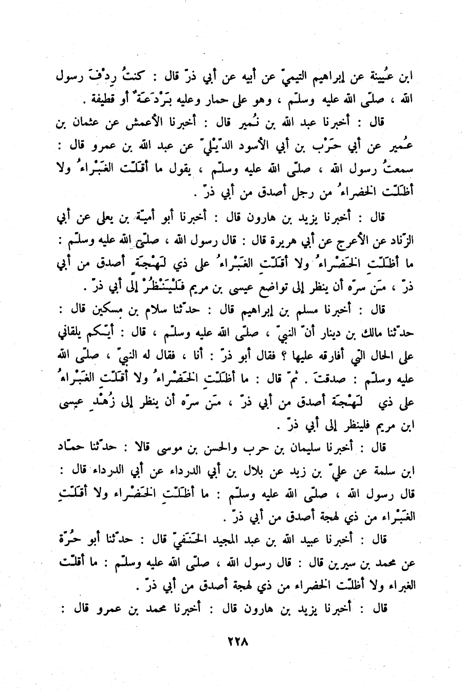 قَالَ: أَخْبَرَنَا يَزِيدُ بْنُ هَارُونَ قَالَ: أَخْبَرَنَا أَبُو أُمَيَّةَ بْنُ يَعْلَى، عَنْ أَبِي الزِّنَادِ، عَنِ الْأَعْرَجِ، عَنْ أَبِي هُرَيْرَةَ قَالَ: قَالَ رَسُولُ اللَّهِ صلّى الله عليه وسلم: «مَا §أَظَلَّتِ الْخَضْرَاءُ، وَلَا أَقَلَّتِ الْغَبْرَاءُ عَلَى ذِي لَهْجَةٍ أَصْدَقَ مِنْ أَبِي ذَرٍّ , مَنْ سَرَّهُ أَنْ يَنْظُرَ إِلَى تَوَاضَعِ عِيسَى ابْنِ مَرْيَمَ، فَلْيَنْظُرْ إِلَى أَبِي ذَرٍّ»