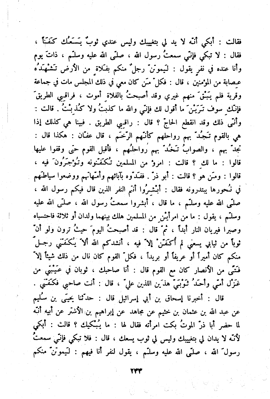 قَالَ: أَخْبَرَنَا إِسْحَاقُ بْنُ أَبِي إِسْرَائِيلَ قَالَ: حَدَّثَنَا يَحْيَى بْنُ سُلَيْمٍ، عَنْ عَبْدِ اللَّهِ بْنِ عُثْمَانَ بْنِ خُثَيْمٍ، عَنْ مُجَاهِدٍ، عَنْ إِبْرَاهِيمَ بْنِ الْأَشْتَرِ، عَنْ أَبِيهِ، أَنَّهُ لَمَّا حَضَرَ أَبَا ذَرٍّ الْمَوْتُ بَكَتِ امْرَأَتُهُ فَقَالَ لَهَا: مَا يُبْكِيكِ؟، قَالَتْ: أَبْكِي لِأَنَّهُ لَا يَدَانِ لِي بِتَغْيِيبِكَ، وَلَيْسَ لِي ثَوْبٌ يَسَعُكَ، قَالَ: فَلَا تَبْكِي , فَإِنِّي سَمِعْتُ رَسُولَ اللَّهِ صلّى الله عليه وسلم يَقُولُ لِنَفَرٍ أَنَا فِيهِمُ: «§لَيَمُوتَنَّ مِنْكُمْ -[234]- رَجُلٌ بِفَلَاةٍ مِنَ الْأَرْضِ , تَشْهَدُهُ عِصَابَةٌ مِنَ الْمُؤْمِنِينَ» ، وَلَيْسَ مِنْ أُولَئِكِ النَّفَرِ رَجُلٌ إِلَّا قَدْ مَاتَ فِي قَرْيَةٍ وَجَمَاعَةٍ مِنَ الْمُسْلِمِينَ، وَأَنَا الَّذِي أَمُوتُ بِفَلَاةٍ، وَاللَّهِ مَا كَذَبْتُ وَلَا كُذِبْتُ , فَأَبْصِرِي الطَّرِيقَ، فَقَالَتْ: أَنَّى وَقَدِ انْقَطَعَ الْحَاجُّ وَتَقَطَّعَتِ الطُّرُقُ، فَكَانَتْ تَشُدُّ إِلَى كَثِيبٍ تَقُومُ عَلَيْهِ تَنْظُرُ , ثُمَّ تَرْجِعُ إِلَيْهِ , فَتُمَرِّضُهُ , ثُمَّ تَرْجِعُ إِلَى الْكَثِيبِ , فَبَيْنَا هِيَ كَذَلِكَ إِذَا هِيَ بِنَفَرٍ تَخُدُّ بِهِمْ رَوَاحِلُهُمْ كَأَنَّهُمُ الرَّخَمُ عَلَى رِحَالِهِمْ، فَأَلَاحَتْ بِثَوْبِهَا , فَأقْبَلُوا حَتَّى وَقَفُوا عَلَيْهَا , قَالُوا: مَا لَكَ؟، قَالَتِ امْرُؤٌ مِنَ الْمُسْلِمِينَ يَمُوتُ تُكَفِّنُونَهُ، قَالُوا: وَمَنْ هُوَ؟ قَالَتْ: أَبُو ذَرٍّ , فَفَدَوْهُ بِآبَائِهِمْ وَأُمَّهَاتِهُمْ وَوَضَعُوا السِّيَاطَ فِي نُحُورِهَا يَسْتَبِقُونَ إِلَيْهِ حَتَّى جَاءُوهُ، فَقَالَ: أَبْشِرُوا , فَحَدَّثَهُمُ الْحَدِيثَ الَّذِي قَالَ رَسُولُ اللَّهِ صلّى الله عليه وسلم، ثُمَّ قَالَ: إِنِّي سَمِعْتُ رَسُولَ اللَّهِ صلّى الله عليه وسلم يَقُولُ: «لَا يَمُوتُ بَيْنَ امْرَأَيْنِ مُسْلِمَيْنِ وَلَدَانِ أَوْ ثَلَاثَةٌ فَيَحْتَسِبَانِ وَيَصْبِرَانِ فَيَرَيَانِ النَّارَ» ، أَنْتُمْ تَسْمَعُونَ لَوْ كَانَ لِي ثَوْبٌ يَسَعُنِي كَفَنًا لَمْ أُكَفَّنْ إِلَّا فِي ثَوْبٍ هُوَ لِي أَوْ لِامْرَأَتِي ثَوْبٌ يَسَعُنِي لَمْ أُكَفَّنْ إِلَّا فِي ثَوْبِهَا، فَأَنْشُدُكُمُ اللَّهَ وَالْإِسْلَامَ أَلَا يُكَفِّنِّي رَجُلٌ مِنْكُمْ كَانَ أَمِيرًا أَوْ عَرِيفًا , أَوْ نَقِيبًا , أَوْ بَرِيدًا، فَكُلُّ الْقَوْمِ قَدْ كَانَ قَارَفَ بَعْضَ ذَلِكَ إِلَّا فَتًى مِنَ الْأَنْصَارِ قَالَ: أَنَا أُكَفِّنُكَ، فَإِنِّي لَمْ أُصِبْ مِمَّا ذَكَرْتَ شَيْئًا، أُكَفِّنُكَ فِي رِدَائِي هَذَا الَّذِي عَلَيَّ وَفِي ثَوْبَيْنِ فِي عَيْبَتِي مِنْ غَزْلِ أُمِّي حَاكَتْهُمَا لِي، قَالَ: أَنْتَ فَكَفِّنِّي , قَالَ: فَكَفَّنَهُ الْأَنْصَارِيُّ فِي النَّفَرِ الَّذِينَ شَهِدُوهُ مِنْهُمْ حُجْرُ بْنُ الْأَدْبَرِ , وَمَالِكٌ الْأَشْتَرُ فِي نَفَرٍ كُلُّهُمْ يَمَانٍ