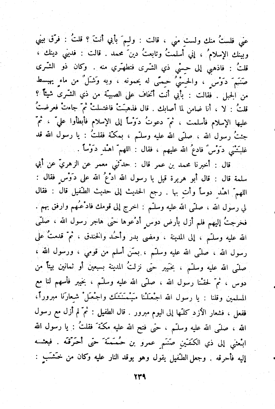 عَنِّي فَلَسْتُ مِنْكَ وَلَسْتِ مِنِّي، قَالَتْ: وَلِمَ بِأَبِي أَنْتَ؟، قُلْتُ: فَرَّقَ بَيْنِي وَبَيْنَكِ الْإِسْلَامُ، إِنِّي أَسْلَمْتُ وَتَابَعْتُ دِينَ مُحَمَّدٍ، قَالَتْ: فَدِينِي دِينُكَ، قُلْتُ: فَاذْهَبِي إِلَى حِسْيِ ذِي الشِّرَى فَتَطَهَّرِي مِنْهُ، وَكَانَ ذُو الشِّرَى صَنَمَ دَوْسٍ، وَالْحِسْيِ حِمَى لَهُ يُحَمُّونَهُ , وَبِهِ وَشَلٌ مِنْ مَاءٍ يَهْبِطُ مِنَ الْجَبَلِ، فَقَالَتْ: بِأَبِي أَنْتَ أَتَخَافُ عَلَى الصِّبْيَةِ مِنْ ذِي الشِّرَى شَيْئًا؟، قُلْتُ: لَا، أَنَا ضَامِنٌ لِمَا أَصَابَكِ، قَالَ: فَذَهَبَتْ فَاغْتَسَلَتْ، ثُمَّ جَاءَتْ , فَعَرَضْتُ عَلَيْهَا الْإِسْلَامَ , فَأَسْلَمَتْ، ثُمَّ دَعَوْتُ دَوْسًا إِلَى الْإِسْلَامِ , فَأَبْطَأُوا عَلَيَّ، ثُمَّ جِئْتُ رَسُولَ اللَّهِ صلّى الله عليه وسلم بِمَكَّةَ , فَقُلْتُ: يَا رَسُولَ اللَّهِ، قَدْ غَلَبَتْنِي دَوْسٌ فَادْعُ اللَّهَ عَلَيْهِمْ , فَقَالَ: «اللَّهُمَّ اهْدِ دَوْسًا»