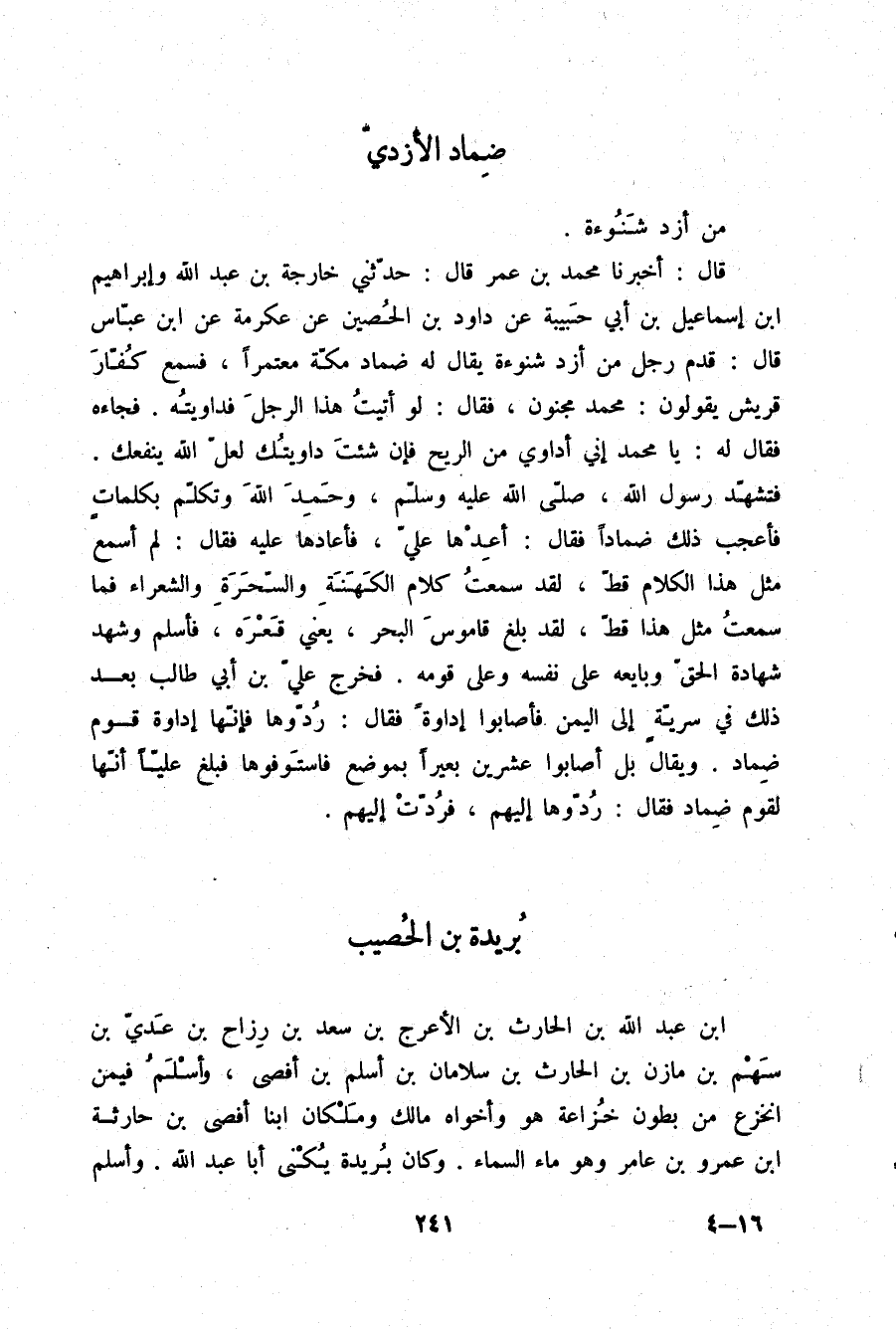 قَالَ: أَخْبَرَنَا مُحَمَّدُ بْنُ عُمَرَ قَالَ: حَدَّثَنِي خَارِجَةُ بْنُ عَبْدِ اللَّهِ، وَإِبْرَاهِيمُ بْنُ إِسْمَاعِيلَ بْنِ أَبِي حَبِيبَةَ، عَنْ دَاوُدَ بْنِ الْحُصَيْنِ، عَنْ عِكْرِمَةَ، عَنِ ابْنِ عَبَّاسٍ قَالَ: قَدِمَ رَجُلٌ مِنْ أَزْدِ شَنُوءَةَ يُقَالُ لَهُ: §ضِمَادٌ مَكَّةَ مُعْتَمِرًا , فَسَمِعَ كُفَّارَ قُرَيْشٍ يَقُولُونَ: مُحَمَّدٌ مَجْنُونٌ، فَقَالَ: لَوْ أَتَيْتُ هَذَا الرَّجُلَ فَدَاوَيْتُهُ، فَجَاءَهُ , فَقَالَ لَهُ: يَا مُحَمَّدُ إِنِّي أُدَاوِي مِنَ الرِّيحِ , فَإِنْ شِئْتَ دَاوَيْتُكَ لَعَلَّ اللَّهَ يَنْفَعُكَ , فَتَشَهَّدَ رَسُولُ اللَّهِ صلّى الله عليه وسلم , وَحَمِدَ اللَّهَ وَتَكَلَّمَ بِكَلِمَاتٍ , فَأَعْجَبَ ذَلِكَ ضِمَادًا , فَقَالَ: أَعِدْهَا عَلَيَّ، فَأَعَادَهَا عَلَيْهِ , فَقَالَ: لَمْ أَسْمَعْ مِثْلَ هَذَا الْكَلَامِ قَطُّ، لَقَدْ سَمِعْتُ كَلَامَ الْكَهَنَةِ وَالسَّحَرَةِ وَالشُّعَرَاءِ , فَمَا سَمِعْتُ مِثْلَ هَذَا قَطُّ، لَقَدْ بَلَغَ قَامُوسَ الْبَحْرِ - يَعْنِي قَعْرَهُ - فَأَسْلَمَ وَشَهِدَ شَهَادَةَ الْحَقِّ وَبَايَعَهُ عَلَى نَفْسِهِ وَعَلَى قَوْمِهِ، فَخَرَجَ عَلِيُّ بْنُ أَبِي طَالِبٍ بَعْدَ ذَلِكَ فِي سَرِيَّةٍ إِلَى الْيَمَنِ , فَأَصَابُوا إِدَاوَةً , فَقَالَ: رُدُّوهَا , فَإِنَّهَا إِدَاوَةُ قَوْمِ ضِمَادٍ وَيُقَالُ: بَلْ أَصَابُوا عِشْرِينَ بَعِيرًا بِمَوْضِعٍ , فَاسْتَوْفَوْهَا , فَبَلَغَ عَلِيًّا أَنَّهَا لِقَوْمِ ضِمَادٍ , فَقَالَ: رُدُّوهَا إِلَيْهِمْ , فَرُدَّتْ إِلَيْهِمْ
