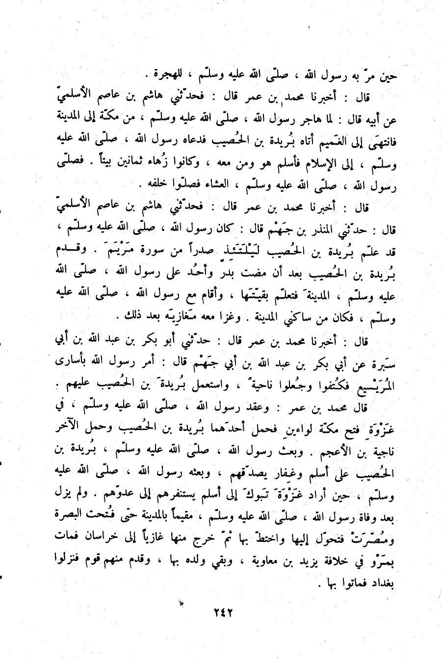 قَالَ: أَخْبَرَنَا مُحَمَّدُ بْنُ عُمَرَ قَالَ: فَحَدَّثَنِي هَاشِمُ بْنُ عَاصِمٍ الْأَسْلَمِيُّ قَالَ: حَدَّثَنِي الْمُنْذِرُ بْنُ جَهْمٍ قَالَ: كَانَ رَسُولُ اللَّهِ صلّى الله عليه وسلم قَدْ §عَلَّمَ بُرَيْدَةَ بْنَ الْحُصَيْبِ لَيْلَتَئِذٍ صَدْرًا مِنْ سُورَةِ مَرْيَمَ، وَقَدِمَ بُرَيْدَةُ بْنُ الْحُصَيْبِ بَعْدَ أَنْ مَضَتْ بَدْرٌ وَأُحُدٌ عَلَى رَسُولِ اللَّهِ صلّى الله عليه وسلم الْمَدِينَةَ , فَتَعَلَّمَ بَقِيَّتَهَا، وَأَقَامَ مَعَ رَسُولِ اللَّهِ صلّى الله عليه وسلم، فَكَانَ مِنْ سَاكِنِي الْمَدِينَةِ، وَغَزَا مَعَهُ مَغَازِيَهُ بَعْدَ ذَلِكَ