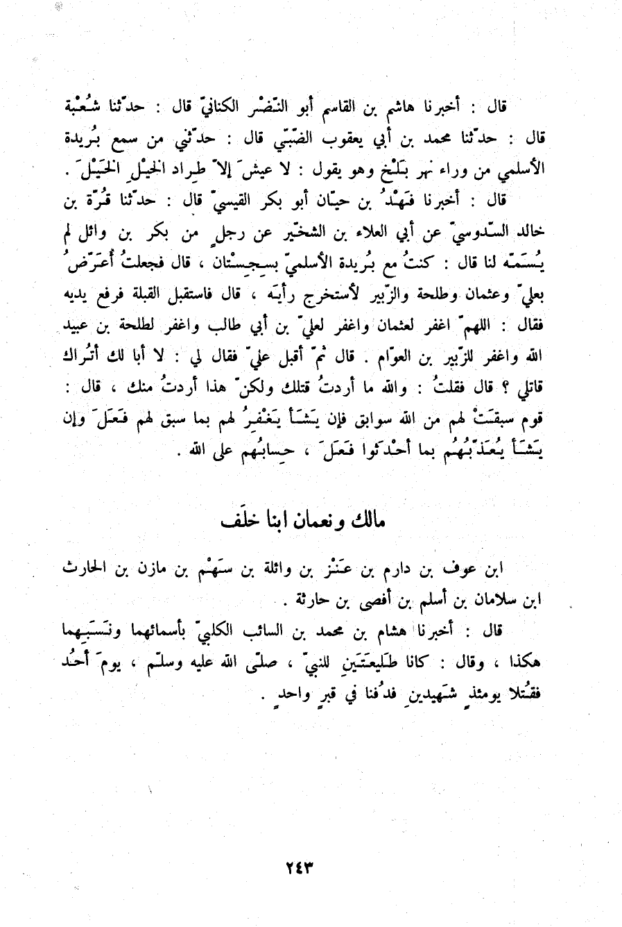 §مَالِكٌ وَنُعْمَانُ ابْنَا خَلَفِ بْنِ عَوْفِ بْنِ دَارِمِ بْنِ عَنْزِ بْنِ وَائِلَةَ بْنِ سَهْمِ بْنِ مَازِنِ بْنِ الْحَارِثِ بْنِ سَلَامَانَ بْنِ أَسْلَمَ بْنِ أَفْصَى بْنِ حَارِثَةَ