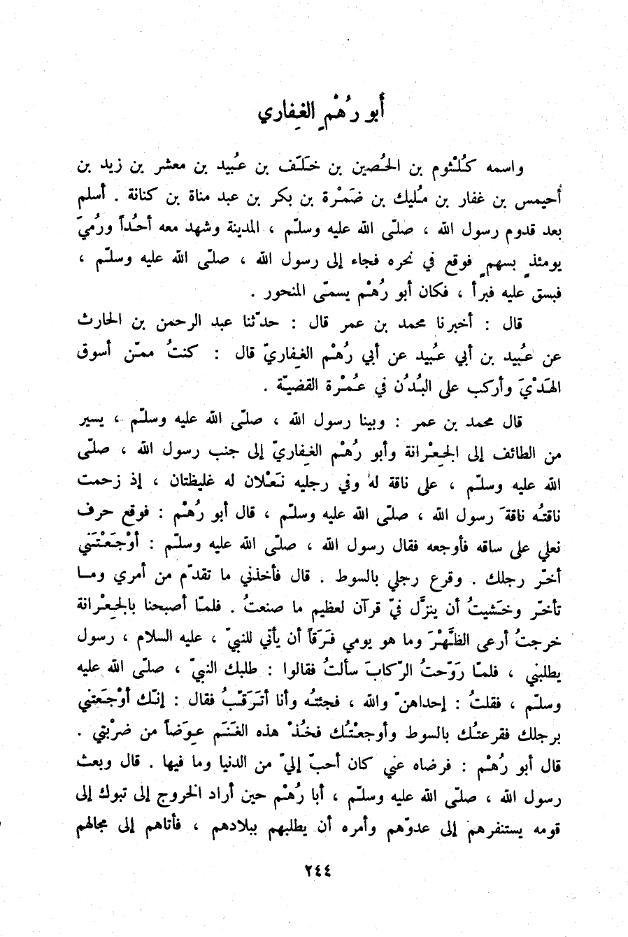 قَالَ: أَخْبَرَنَا مُحَمَّدُ بْنُ عُمَرَ قَالَ: حَدَّثَنَا عَبْدُ الرَّحْمَنِ بْنُ الْحَارِثِ، عَنْ عُبَيْدِ بْنِ أَبِي عُبَيْدٍ، عَنْ أَبِي رُهْمٍ الْغِفَارِيِّ قَالَ: كُنْتُ مِمَّنْ §أَسُوقُ الْهَدْيَ وَأَرْكَبُ عَلَى الْبُدْنِ فِي عَمْرَةِ الْقَضِيَّةِ قَالَ مُحَمَّدُ بْنُ عُمَرَ: وَبَيْنَا رَسُولُ اللَّهِ صلّى الله عليه وسلم يَسِيرُ مِنَ الطَّائِفِ إِلَى الْجِعْرَانَةِ، وَأَبُو رُهْمٍ الْغِفَارِيُّ إِلَى جَنْبِ رَسُولِ اللَّهِ صلّى الله عليه وسلم عَلَى نَاقَةٍ لَهُ، وَفِي رِجْلَيْهِ نَعْلَانِ لَهُ غَلِيظَتَانِ إِذْ زَحَمَتْ نَاقَتُهُ نَاقَةَ رَسُولِ اللَّهِ صلّى الله عليه وسلم، قَالَ أَبُو رُهْمٍ: فَوَقَعَ حَرْفُ نَعْلِي عَلَى سَاقِهِ , فَأَوْجَعَهُ، فَقَالَ رَسُولُ اللَّهِ صلّى الله عليه وسلم: «أَوْجَعْتَنِي أَخِّرْ رِجْلَكَ» ، وَقَرَعَ رِجْلِي بِالسَّوْطِ، قَالَ: فَأَخَذَنِي مَا تَقَدَّمَ مِنْ أَمْرِي وَمَا تَأَخَّرَ , وَخَشِيتُ أَنْ يَنْزِلَ فِيَّ قُرْآنٌ لَعَظِيمِ مَا صَنَعْتُ، فَلَمَّا أَصْبَحْنَا بِالْجِعْرَانَةِ خَرَجْتُ أَرْعَى الظُّهْرَ وَمَا هُوَ يَوْمِي فَرَقًا أَنْ يَأْتِيَ لِلنَّبِيِّ عَلَيْهِ السَّلَامُ رَسُولٌ يَطْلُبُنِي , فَلَمَّا رَوَّحْتُ الرِّكَابَ , سَأَلْتُ: فَقَالُوا: طَلَبَكَ النَّبِيُّ صلّى الله عليه وسلم , فَقُلْتُ: إِحْدَاهُنَّ وَاللَّهِ , فَجِئْتُهُ وَأَنَا أَتَرَقَّبُ , فَقَالَ: «إِنَّكَ أَوْجَعَتْنِي بِرِجْلِكَ فَقَرَعْتُكَ بِالسَّوْطِ , وَأَوْجَعْتُكَ , فَخُذْ هَذِهِ الْغَنَمَ عِوَضًا مِنْ ضَرْبَتِي» ، قَالَ أَبُو رُهْمٍ: فَرِضَاهُ عَنِّي كَانَ أَحَبَّ إِلَيَّ مِنَ الدُّنْيَا وَمَا فِيهَا قَالَ: وَبَعَثَ رَسُولُ اللَّهِ صلّى الله عليه وسلم أَبَا رُهْمٍ حِينَ أَرَادَ الْخُرُوجَ إِلَى تَبُوكَ إِلَى قَوْمِهِ يَسْتَنْفِرُهُمْ إِلَى عَدُوِّهِمْ , وَأَمَرَهُ أَنْ يَطْلُبَهُمْ بِبِلَادِهِمْ، فَأَتَاهُمْ إِلَى مَجَالِهِمْ ,
