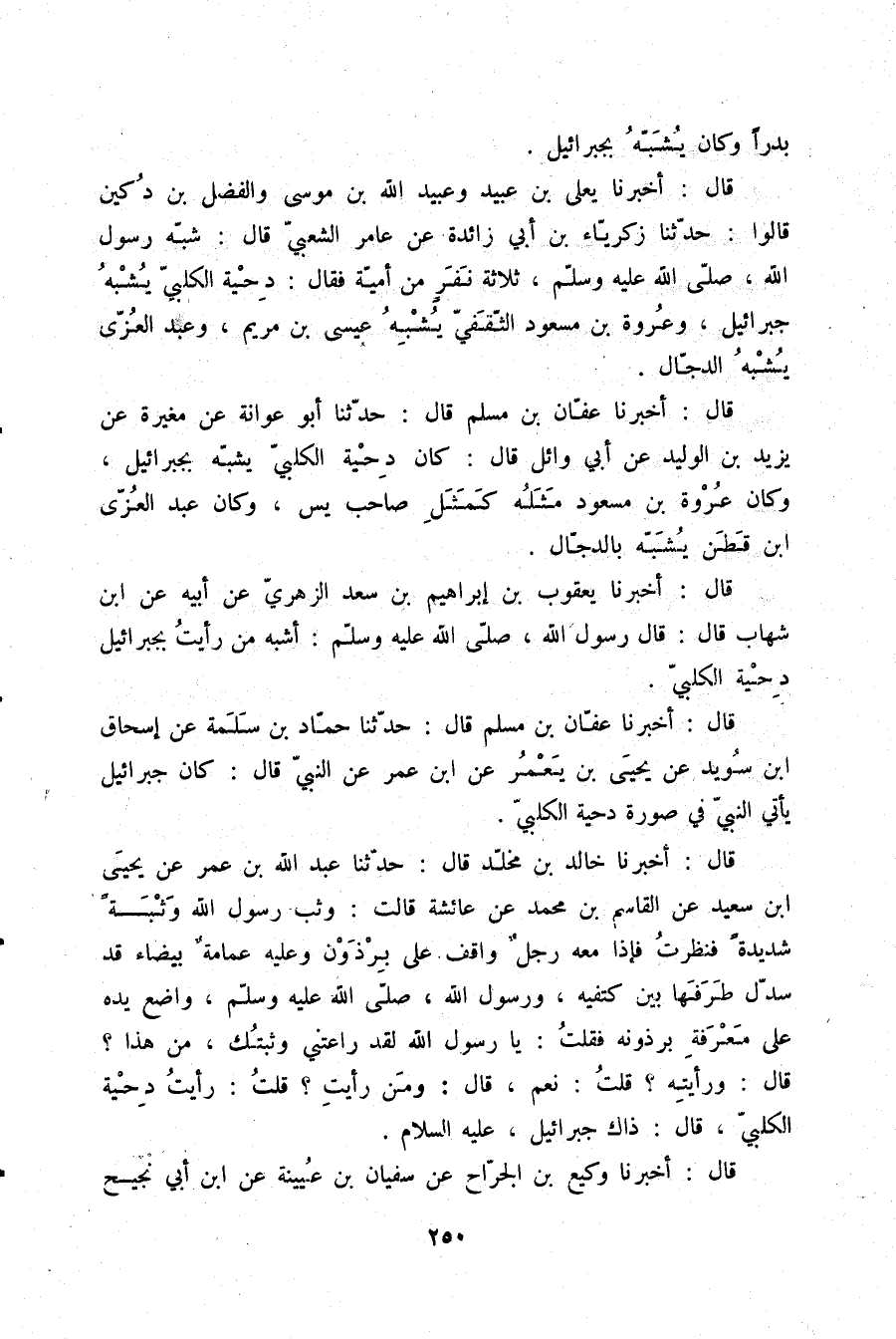 قَالَ: أَخْبَرَنَا عَفَّانُ بْنُ مُسْلِمٍ قَالَ: حَدَّثَنَا حَمَّادُ بْنُ سَلَمَةَ، عَنْ إِسْحَاقَ بْنِ سُوَيْدٍ، عَنْ يَحْيَى بْنِ يَعْمَرَ، عَنِ ابْنِ عُمَرَ، عَنِ النَّبِيِّ قَالَ: «كَانَ §جَبْرَائِيلُ يَأْتِي النَّبِيَّ فِي صُورَةِ دِحْيَةَ الْكَلْبِيِّ»