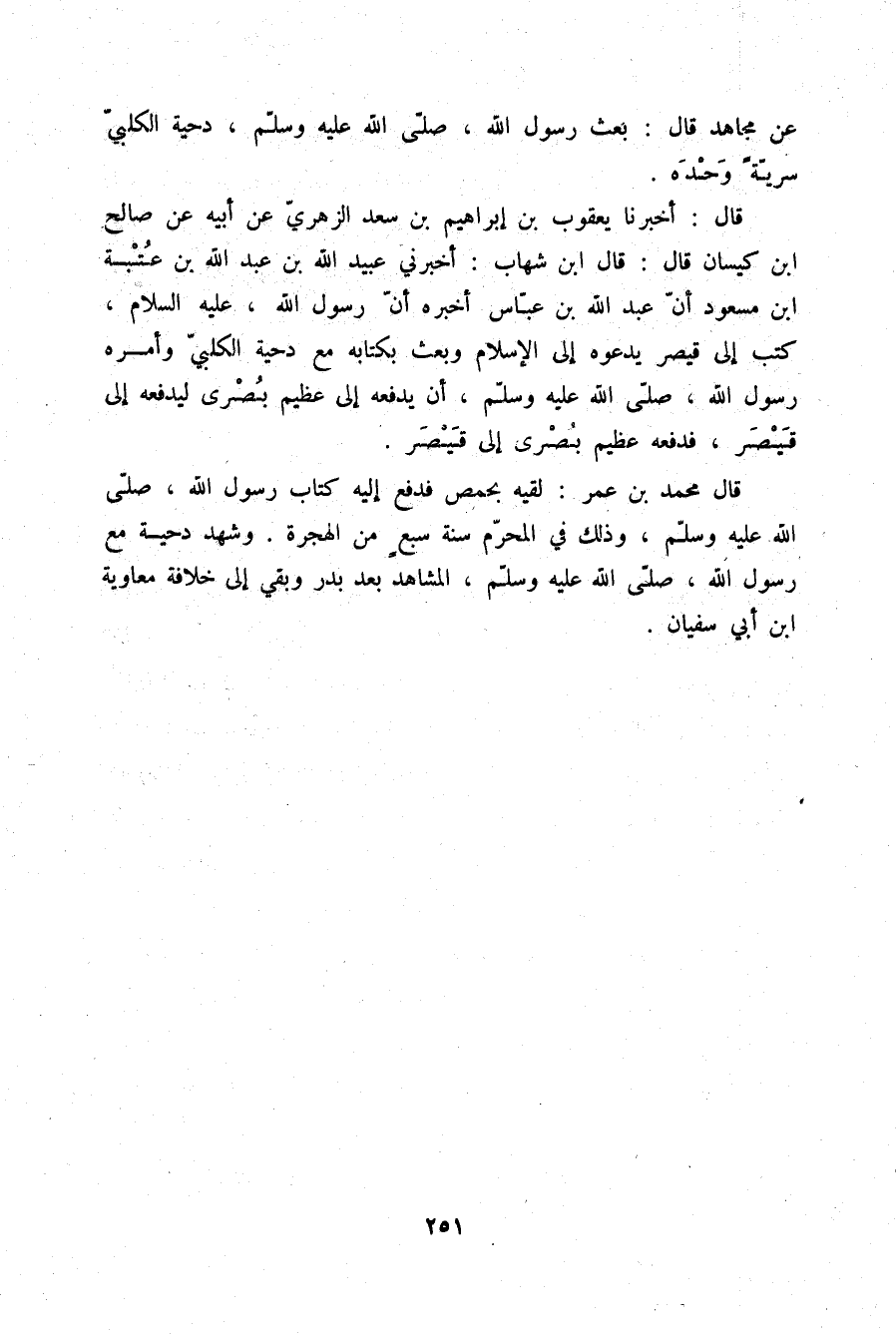 قَالَ: أَخْبَرَنَا يَعْقُوبُ بْنُ إِبْرَاهِيمَ بْنِ سَعْدٍ الزُّهْرِيُّ، عَنْ أَبِيهِ، عَنْ صَالِحِ بْنِ كَيْسَانَ قَالَ: قَالَ ابْنُ شِهَابٍ: أَخْبَرَنِي عُبَيْدُ اللَّهِ بْنُ عَبْدِ اللَّهِ بْنِ عُتْبَةَ بْنِ مَسْعُودٍ أَنَّ عَبْدَ اللَّهِ بْنَ عَبَّاسٍ أَخْبَرَهُ أَنَّ رَسُولَ اللَّهِ عَلَيْهِ السَّلَامُ §كَتَبَ إِلَى قَيْصَرٍ يَدْعُوهُ إِلَى الْإِسْلَامِ , وَبَعَثَ بِكِتَابِهِ مَعَ دِحْيَةَ الْكَلْبِيِّ، وَأَمَرَهُ رَسُولُ اللَّهِ صلّى الله عليه وسلم أَنْ يَدْفَعَهُ إِلَى عَظِيمِ بُصْرَى لِيَدْفَعَهُ إِلَى قَيْصَرَ , فَدَفَعَهُ عَظِيمُ بُصْرَى إِلَى قَيْصَرٍ قَالَ مُحَمَّدُ بْنُ عُمَرَ: لَقِيَهُ بِحِمْصَ، فَدَفَعَ إِلَيْهِ كِتَابَ رَسُولِ اللَّهِ صلّى الله عليه وسلم , وَذَلِكَ فِي الْمُحَرَّمِ سَنَةَ سَبْعٍ مِنَ الْهِجْرَةِ. وَشَهِدَ دِحْيَةُ مَعَ رَسُولِ اللَّهِ صلّى الله عليه وسلم الْمَشَاهِدَ بَعْدَ بَدْرٍ , وَبَقِيَ إِلَى خِلَافَةِ مُعَاوِيَةَ بْنِ أَبِي سُفْيَانَ
