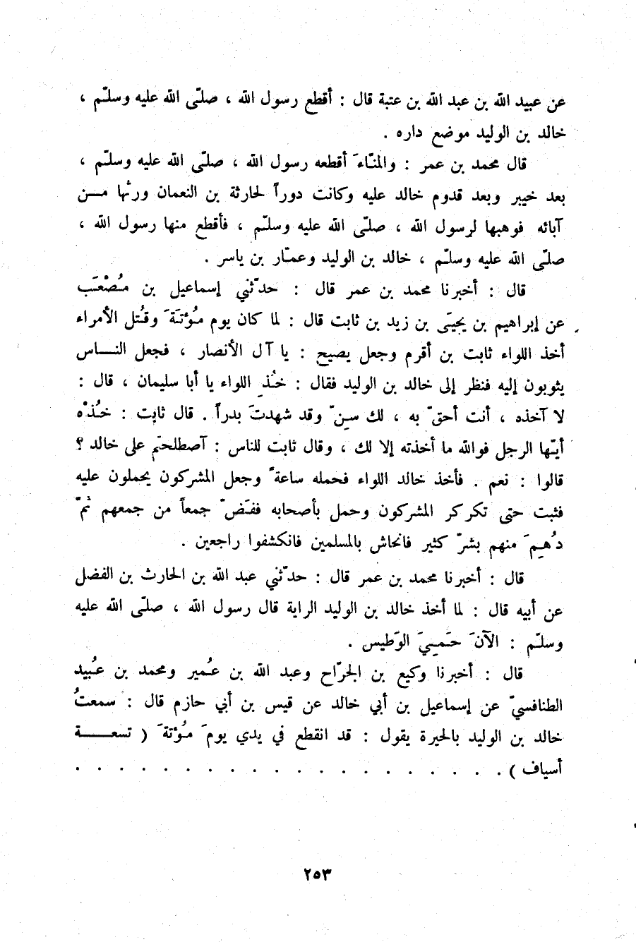 قَالَ: أَخْبَرَنَا مُحَمَّدُ بْنُ عُمَرَ قَالَ: حَدَّثَنِي عَبْدُ اللَّهِ بْنُ الْحَارِثِ بْنِ الْفَضْلِ، عَنْ أَبِيهِ قَالَ: لَمَّا أَخَذَ خَالِدُ بْنُ الْوَلِيدِ الرَّايَةَ قَالَ رَسُولُ اللَّهِ صلّى الله عليه وسلم: «§الْآنَ حَمِيَ الْوَطِيسُ»