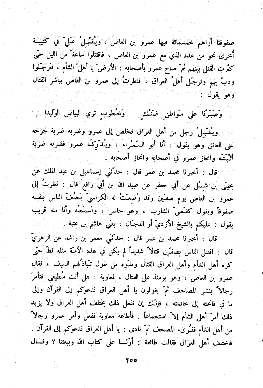 صُفُوفِنَا أَرَاهُمْ خَمْسَمِائَةٍ فِيهَا عَمْرُو بْنُ الْعَاصِ، وَيُقْبِلُ عَلِيٌّ فِي كَتِيبَةٍ أُخْرَى نَحْوًا مِنْ عَدَدِ الَّذِي مَعَ عَمْرِو بْنِ الْعَاصِ فَاقْتَتَلُوا سَاعَةً مِنَ اللَّيْلِ حَتَّى كَثُرَتِ الْقَتْلَى بَيْنَهُمْ، ثُمَّ صَاحَ عَمْرٌو بِأَصْحَابِهِ: الْأَرْضَ يَا أَهْلَ الشَّامَ، فَتَرَجَّلُوا وَدَبَّ بِهِمْ وَتَرَجَّلَ أَهْلُ الْعِرَاقِ , فَنَظَرْتُ إِلَى عَمْرِو بْنِ الْعَاصِ يُبَاشِرُ الْقِتَالَ وَهُوَ يَقُولُ: