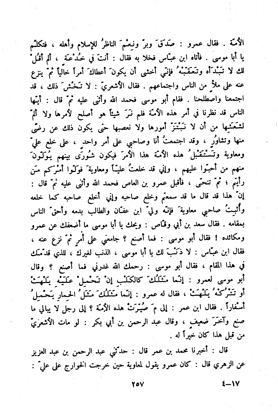 الْأُمَّةِ , فَقَالَ عَمْرٌو: صَدَقَ وَبَرَّ وَنِعْمَ النَّاظِرُ لِلْإِسْلَامِ وَأَهْلِهِ , فَتَكَلَّمْ يَا أَبَا مُوسَى: فَأَتَاهُ ابْنُ عَبَّاسٍ , فَخَلَا بِهِ , فَقَالَ: أَنْتَ فِي خُدْعَةٍ أَلَمْ أَقُلْ لَكَ: لَا تَبْدَأْهُ، وَتَعَقَّبْهُ؟ فَإِنِّي أَخْشَى أَنْ يَكُونَ أَعْطَاكَ أَمْرًا خَالِيًا , ثُمَّ يَنْزِعَ عَنْهُ عَلَى مَلَإٍ مِنَ النَّاسِ وَاجْتِمَاعِهِمْ، فَقَالَ الْأَشْعَرِيُّ: لَا تَخْشَ ذَلِكَ، قَدِ اجْتَمَعْنَا وَاصْطَلَحْنَا , فَقَامَ أَبُو مُوسَى , فَحَمِدَ اللَّهَ وَأَثْنَى عَلَيْهِ , ثُمَّ قَالَ: أَيُّهَا النَّاسُ قَدْ نَظَرْنَا فِي أَمْرِ هَذِهِ الْأُمَّةِ فَلَمْ نَرَ شَيْئًا هُوَ أَصْلَحُ لِأَمْرِهَا وَلَا أَلَمُّ لِشَعَثِهَا مِنْ أَنْ لَا نَبْتَزَّ أُمُورَهَا وَلَا نَعْصِبَهَا حَتَّى يَكُونَ ذَلِكَ عَنْ رَضًى مِنْهَا وَتَشَاورٍ وَقَدِ اجْتَمَعَتُ أَنَا وَصَاحِبِي عَلَى أَمْرٍ وَاحِدٍ عَلَى خَلْعِ عَلِيٍّ وَمُعَاوِيَةَ , وَتَسْتَقْبِلُ هَذِهِ الْأُمَّةُ هَذَا الْأَمْرَ , فَيَكُونُ شُورَى بَيْنَهُمْ يُوَلُّونَ مِنْهُمْ مَنْ أَحَبُّوا عَلَيْهِمْ وَإِنِّي قَدْ خَلَعْتُ عَلِيًّا وَمُعَاوِيَةَ , فَوَلُّوا أَمْرَكُمْ مَنْ رَأَيْتُمْ، ثُمَّ تَنَحَّى , فَأَقْبَلَ عَمْرُو بْنُ الْعَاصِ , فَحَمِدَ اللَّهَ وَأَثْنَى عَلَيْهِ , ثُمَّ قَالَ: إِنَّ هَذَا قَدْ قَالَ مَا قَدْ سَمِعْتُمْ , وَخَلَعَ صَاحِبَهُ وَإِنِّي أَخْلَعُ صَاحِبَهُ كَمَا خَلْعَهُ وَأُثْبِتُ صَاحِبِي مُعَاوِيَةَ , فَإِنَّهُ وَلِيُّ ابْنُ عَفَّانَ، وَالطَّالِبُ بِدَمِهِ وَأَحَقُّ النَّاسِ بِمَقَامِهِ، فَقَالَ سَعْدُ بْنُ أَبِي وَقَّاصٍ: وَيْحَكَ يَا أَبَا مُوسَى مَا أَضْعَفَكَ عَنْ عَمْرٍو وَمَكَائِدِهِ، فَقَالَ أَبُو مُوسَى: فَمَا أَصْنَعُ جَامَعَنِي عَلَى أَمْرٍ ثُمَّ نَزَعَ عَنْهُ، فَقَالَ ابْنُ عَبَّاسٍ: لَا ذَنْبَ لَكَ يَا أَبَا مُوسَى الذَّنْبُ لِغَيْرِكَ لِلَّذِي قَدَّمَكَ فِي هَذَا الْمَقَامِ، فَقَالَ أَبُو مُوسَى: رَحِمَكَ اللَّهُ غَدَرَنِي فَمَا أَصْنَعُ؟، وَقَالَ أَبُو مُوسَى لِعَمْرٍو: إِنَّمَا مَثَلُكَ كَالْكَلْبِ إِنْ تَحْمِلْ عَلَيْهِ يَلْهَثْ أَوْ تَتْرُكْهُ يَلْهَثْ، فَقَالَ لَهُ عَمْرٌو: إِنَّمَا مَثَلُكَ مَثَلُ الْحِمَارِ يَحْمِلُ أَسْفَارًا، فَقَالَ ابْنُ عُمَرَ إِلَامَ صَيَّرْتَ هَذِهِ الْأُمَّةَ، إِلَى رَجُلٍ لَا يُبَالِي مَا صَنَعَ وَآخَرَ ضَعِيفٌ؟ وَقَالَ عَبْدُ الرَّحْمَنِ بْنُ أَبِي بَكْرٍ: لَوْ مَاتَ الْأَشْعَرِيُّ مِنْ قَبْلِ هَذَا كَانَ خَيْرًا لَهُ