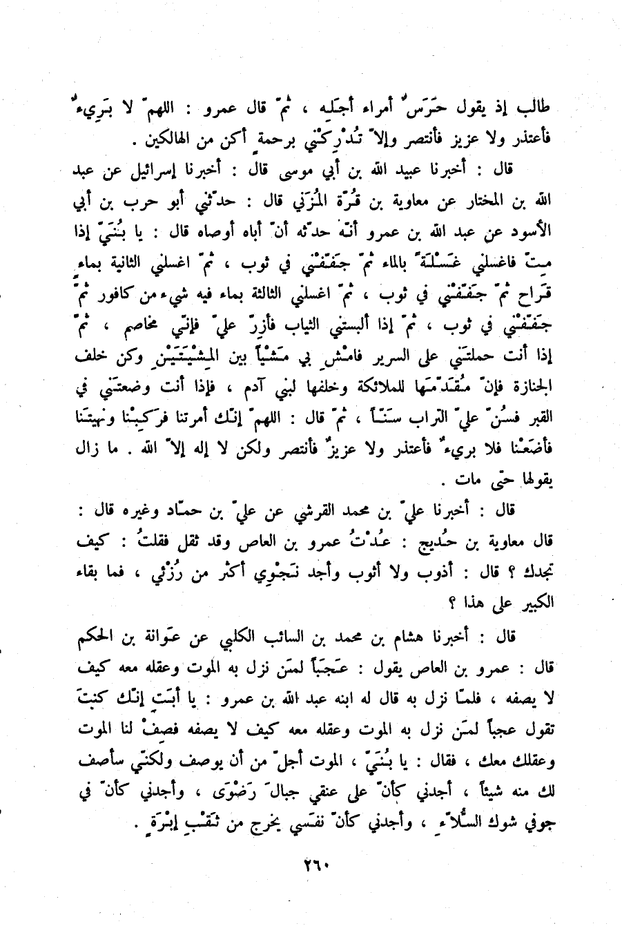 قَالَ: أَخْبَرَنَا عُبَيْدُ اللَّهِ بْنُ أَبِي مُوسَى قَالَ: أَخْبَرَنَا إِسْرَائِيلُ، عَنْ عَبْدِ اللَّهِ بْنِ الْمُخْتَارِ، عَنْ مُعَاوِيَةَ بْنِ قُرَّةَ الْمُزَنِيِّ قَالَ: حَدَّثَنِي أَبُو حَرْبِ بْنُ أَبِي الْأَسْوَدِ، عَنْ عَبْدِ اللَّهِ بْنِ عَمْرٍو أَنَّهُ حَدَّثَهُ أَنَّ أَبَاهُ أَوْصَاهُ قَالَ: يَا بُنَيَّ إِذَا §مِتُّ فَاغْسِلْنِي غَسلَةً بِالْمَاءِ، ثُمَّ جَفِّفْنِي فِي ثَوْبٍ، ثُمَّ اغْسِلْنِي الثَّانِيَةَ بِمَاءٍ قُرَاحٍ ثُمَّ جَفِّفْنِي فِي ثَوْبٍ، ثُمَّ اغْسِلْنِي الثَّالِثَةَ بِمَاءٍ فِيهِ شَيْءٌ مِنَ كَافُورٍ، ثُمَّ جَفِّفْنِي فِي ثَوْبٍ، ثُمَّ إِذَا أَلْبَسْتَنِي الثِّيَابَ فَأَزِرَّ عَلَيَّ , فَإِنِّي مُخَاصِمٌ، ثُمَّ إِذَا أَنْتَ حَمَلْتَنِي عَلَى السَّرِيرِ , فَامْشِ بِي مَشْيًا بَيْنَ الْمَشْيَتَيْنِ وَكُنْ خَلْفَ الْجَنَازَةِ , فَإِنَّ مُقَدَّمَهَا لِلْمَلَائِكَةِ وَخَلْفَهَا لِبَنِي آدَمَ، فَإِذَا أَنْتَ وَضَعْتَنِي فِي الْقَبْرِ فَسُنَّ عَلَيَّ التُّرَابَ سَنًّا، ثُمَّ قَالَ: اللَّهُمَّ إِنَّكَ أَمَرْتَنَا فَرَكِبْنَا وَنَهَيْتَنَا فَأَضَعْنَا فَلَا بَرِيءَ فَأَعْتَذِرُ، وَلَا عَزِيزَ فَأَنْتَصِرُ، وَلَكِنْ لَا إِلَهَ إِلَّا اللَّهُ. مَا زَالَ يَقُولُهَا حَتَّى مَاتَ