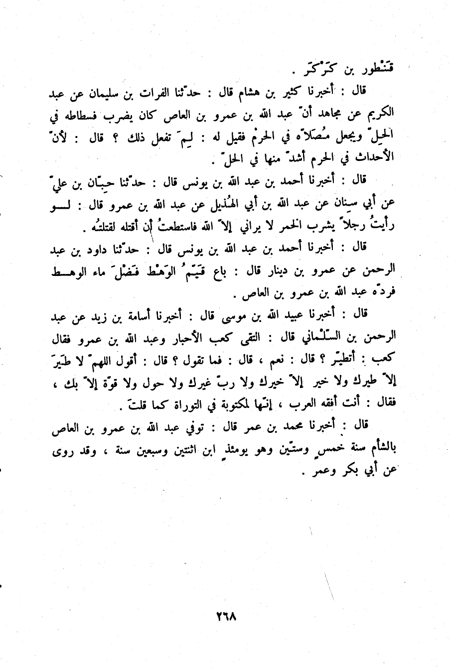 قَالَ: أَخْبَرَنَا عُبَيْدُ اللَّهِ بْنُ مُوسَى قَالَ: أَخْبَرَنَا أُسَامَةُ بْنُ زَيْدٍ، عَنْ عَبْدِ الرَّحْمَنِ بْنِ السَّلْمَانِيِّ قَالَ: الْتَقَى كَعْبُ الْأَحْبَارِ وَعَبْدُ اللَّهِ بْنُ عَمْرٍو فَقَالَ كَعْبٌ: أَتَطَيَّرُ؟ قَالَ: نَعَمْ، قَالَ: فَمَا تَقُولُ؟، قَالَ: أَقُولُ: اللَّهُمَّ §لَا طَيْرَ إِلَّا طَيْرُكَ، وَلَا خَيْرَ إِلَّا خَيْرُكَ، وَلَا رَبَّ غَيْرُكَ، وَلَا حَوْلَ وَلَا قُوَّةَ إِلَّا بِكَ، فَقَالَ: أَنْتَ أَفْقَهُ الْعَرَبِ، إِنَّهَا لَمَكْتُوبَةٌ فِي التَّوْرَاةِ كَمَا قُلْتَ قَالَ: أَخْبَرَنَا مُحَمَّدُ بْنُ عُمَرَ قَالَ: تُوُفِّيَ عَبْدُ اللَّهِ بْنِ عَمْرِو بْنِ الْعَاصِ بِالشَّامِ سَنَةَ خَمْسٍ وَسِتِّينَ وَهُوَ يَوْمَئِذِ ابْنُ اثْنَتَيْنِ وَسَبْعِينَ سَنَةً، وَقَدْ رَوَى عَنْ أَبِي بَكْرٍ وَعُمَرَ