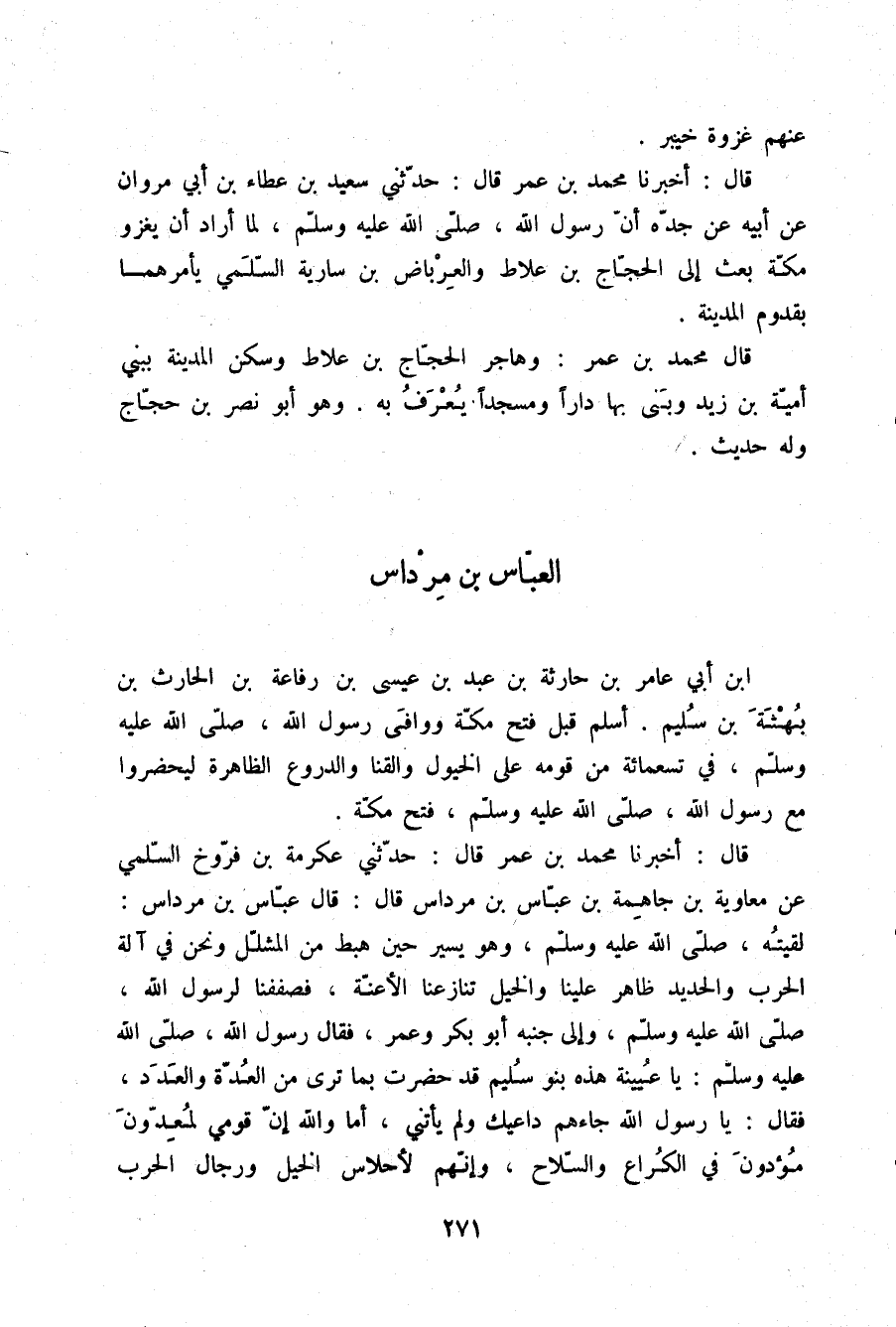 قَالَ: أَخْبَرَنَا مُحَمَّدُ بْنُ عُمَرَ قَالَ: حَدَّثَنِي عِكْرِمَةُ بْنُ فَرُّوخَ السُّلَمِيُّ، عَنْ مُعَاوِيَةَ بْنِ جَاهِمَةَ بْنِ عَبَّاسِ بْنِ مِرْدَاسٍ قَالَ: قَالَ عَبَّاسُ بْنُ مِرْدَاسٍ لَقِيتُهُ صلّى الله عليه وسلم وَهُوَ يَسِيرُ حِينَ هَبَطَ مِنَ الْمُشَلَّلِ , وَنَحْنُ فِي آلَةِ الْحَرْبِ، وَالْحَدِيدُ ظَاهَرٌ عَلَيْنَا , وَالْخَيْلُ تُنَازِعُنَا الْأَعِنَّةَ، فَصَفَفْنَا لِرَسُولِ اللَّهِ صلّى الله عليه وسلم , وَإِلَى جَنْبِهِ أَبُو بَكْرٍ وَعُمَرُ , فَقَالَ رَسُولُ اللَّهِ صلّى الله عليه وسلم: «يَا عُيَيْنَةَ هَذِهِ §بَنُو سُلَيْمٍ قَدْ حَضَرَتْ بِمَا تَرَى مِنَ الْعُدَّةِ وَالْعَدَدِ» ، فَقَالَ: يَا رَسُولَ اللَّهِ جَاءَهُمْ دَاعِيكَ، وَلَمْ يَأْتِنِي أَمَا وَاللَّهِ إِنَّ قَوْمِي لَمُعِدُّونَ مُؤَدُّونَ فِي الْكُرَاعِ وَالسِّلَاحِ، وَإِنَّهُمْ لَأَحْلَاسُ الْخَيْلِ وَرِجَالُ الْحَرْبِ