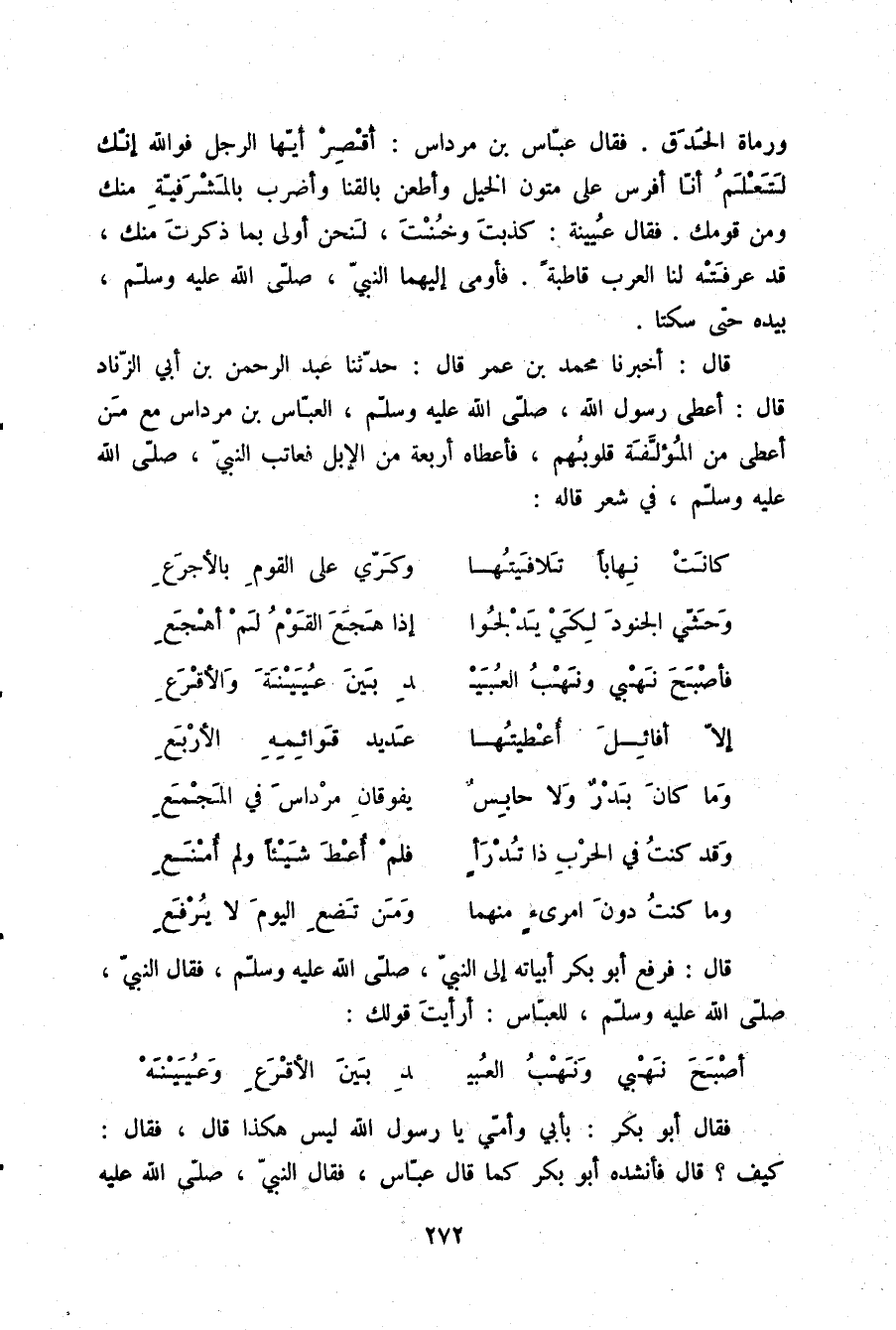 قَالَ: فَرَفَعَ أَبُو بَكْرٍ أَبْيَاتَهُ إِلَى النَّبِيِّ صلّى الله عليه وسلم , فَقَالَ النَّبِيُّ صلّى الله عليه وسلم لِلْعَبَّاسِ: " أَرَأَيْتَ قَوْلَكَ: أَصْبَحَ نَهْبِي وَنَهْبَ الْعُبَيْدِ بَيْنَ الْأَقْرَعِ وَعُيَيْنَةَ "، فَقَالَ أَبُو بَكْرٍ: بِأَبِي وَأُمِّي يَا رَسُولَ اللَّهِ لَيْسَ هَكَذَا، قَالَ: فَقَالَ: «كَيْفَ قَالَ» ؟ فَأَنْشَدَهُ أَبُو بَكْرٍ كَمَا قَالَ عَبَّاسٌ، فَقَالَ النَّبِيُّ صلّى الله عليه