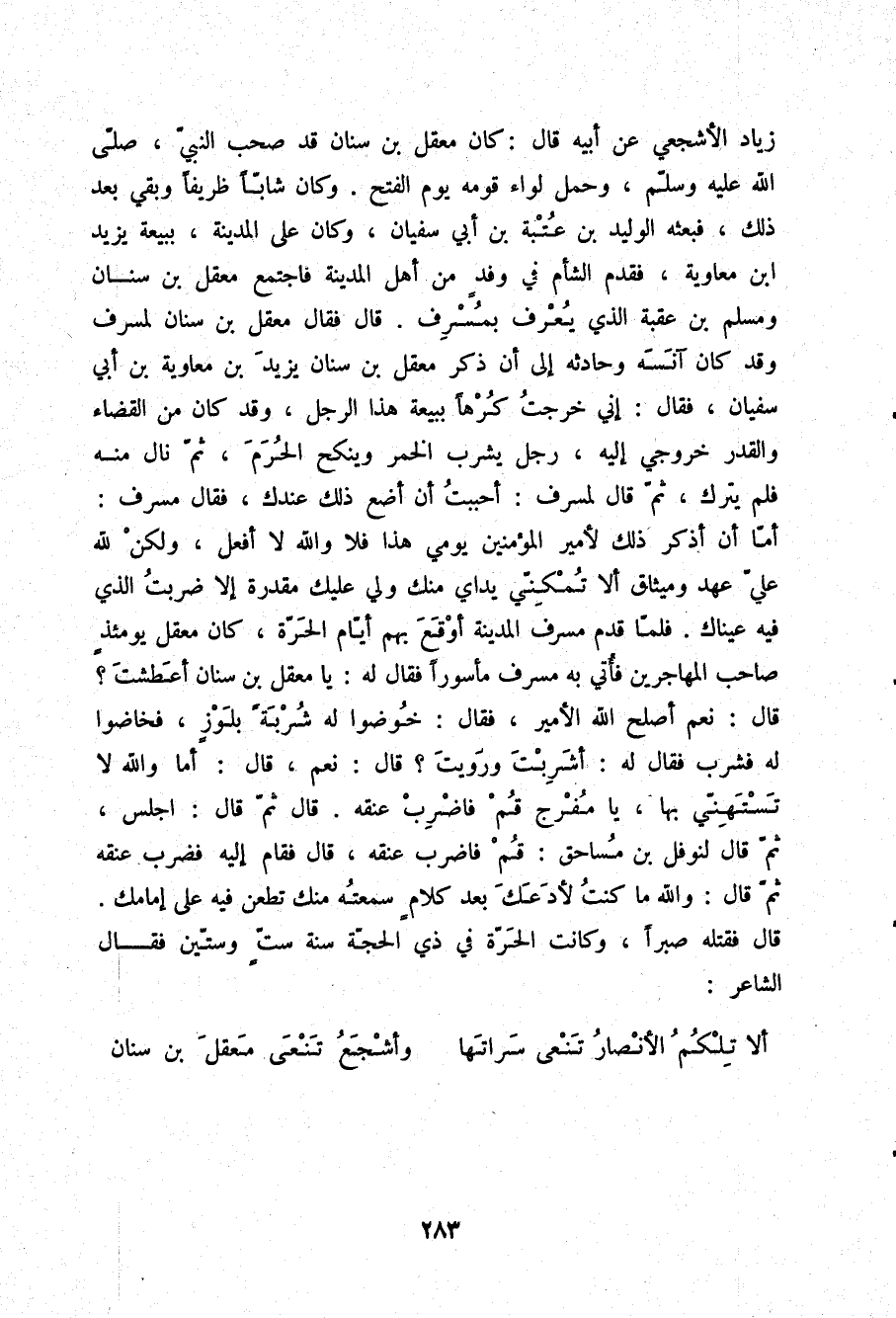 زِيَادٍ الْأَشْجَعِيُّ، عَنْ أَبِيهِ قَالَ: كَانَ §مَعْقِلُ بْنُ سِنَانٍ قَدْ صَحِبَ النَّبِيَّ صلّى الله عليه وسلم , وَحَمَلَ لِوَاءَ قَوْمِهِ يَوْمَ الْفَتْحِ، وَكَانَ شَابًّا ظَرِيفًا , وَبَقِيَ بَعْدَ ذَلِكَ , فَبَعَثَهُ الْوَلِيدُ بْنُ عُتْبَةَ بْنِ أَبِي سُفْيَانَ , وَكَانَ عَلَى الْمَدِينَةِ بِبَيْعَةِ يَزِيدَ بْنِ مُعَاوِيَةَ , فَقَدِمَ الشَّامَ فِي وَفْدٍ مِنْ أَهْلِ الْمَدِينَةِ , فَاجْتَمَعَ مَعْقِلُ بْنُ سِنَانٍ وَمُسْلِمُ بْنُ عُقْبَةَ الَّذِي يُعْرَفُ بِمُسْرِفٍ. قَالَ: فَقَالَ مَعْقِلُ بْنُ سِنَانٍ لِمُسْرِفٍ وَقَدْ كَانَ آنْسَهُ وَحَادَثُهُ إِلَى أَنْ ذَكَرَ مَعْقِلُ بْنُ سِنَانٍ يَزِيدَ بْنِ مُعَاوِيَةَ بْنِ أَبِي سُفْيَانَ , فَقَالَ: إِنِّي خَرَجْتُ كَرْهًا بِبَيْعَةِ هَذَا الرَّجُلِ , وَقَدْ كَانَ مِنَ الْقَضَاءِ وَالْقَدَرِ خُرُوجِي إِلَيْهِ، رَجُلٌ يَشْرَبُ الْخَمْرَ وَيَنْكِحُ الْحُرُمَ , ثُمَّ نَالَ مِنْهُ , فَلَمْ يَتْرُكْ، ثُمَّ قَالَ لِمُسْرِفٍ: أَحْبَبْتُ أَنْ أَضَعَ ذَلِكَ عِنْدَكَ , فَقَالَ مُسْرِفٌ: أَمَّا أَنْ أَذَكُرَ ذَلِكَ لِأَمِيرِ الْمُؤْمِنِينَ يَوْمِي هَذَا فَلَا وَاللَّهِ لَا أَفْعَلُ وَلَكِنْ لِلَّهِ عَلَيَّ عَهْدٌ وَمِيثَاقٌ أَلَّا تُمْكِنِّي يَدَايَ مِنْكَ وَلِي عَلَيْكَ مَقْدِرَةٌ إِلَّا ضَرَبْتُ الَّذِي فِيهِ عَيْنَاكَ، فَلَمَّا قَدِمَ مُسْرِفٌ الْمَدِينَةَ , أَوْقَعَ بِهِمْ أَيَّامَ الْحَرَّةِ , كَانَ مَعْقِلٌ يَوْمَئِذٍ صَاحِبَ الْمُهَاجِرِينَ , فَأَتَى بِهِ مُسْرِفٌ مَأْسُورًا , فَقَالَ لَهُ: يَا مَعْقِلُ بْنُ سِنَانٍ أَعَطِشْتَ؟، قَالَ: نَعَمْ، أَصْلَحَ اللَّهُ الْأَمِيرَ , فَقَالَ: خُوضُوا لَهُ شَرْبَةً بِلَوْزٍ , فَخَاضُوا لَهُ فَشَرِبَ , فَقَالَ: لَهُ أَشَرِبْتَ وَرَوِيتَ؟، قَالَ: نَعَمْ، قَالَ: أَمَا وَاللَّهِ لَا تَسْتَهْنِي بِهَا يَا مُفَرِّجُ، قُمْ , فَاضْرِبْ عُنُقَهُ، قَالَ: ثُمَّ قَالَ: اجْلِسْ , ثُمَّ قَالَ: لِنَوْفَلِ بْنِ مُسَاحِقٍ: قُمْ , فَاضْرِبْ عُنُقَهُ، قَالَ: فَقَامَ إِلَيْهِ , فَضَرَبَ عُنُقَهُ , ثُمَّ قَالَ: وَاللَّهِ مَا كُنْتُ لِأَدَعَكَ بَعْدَ كَلَامٍ سَمِعْتُهُ مِنْكَ تَطْعَنُ فِيهِ عَلَى إِمَامِكَ، قَالَ: فَقَتَلَهُ صَبْرًا، وَكَانَتِ الْحَرَّةُ فِي ذِي الْحِجَّةِ سَنَةَ سِتٍّ وَسِتِّينَ , فَقَالَ الشَّاعِرُ: