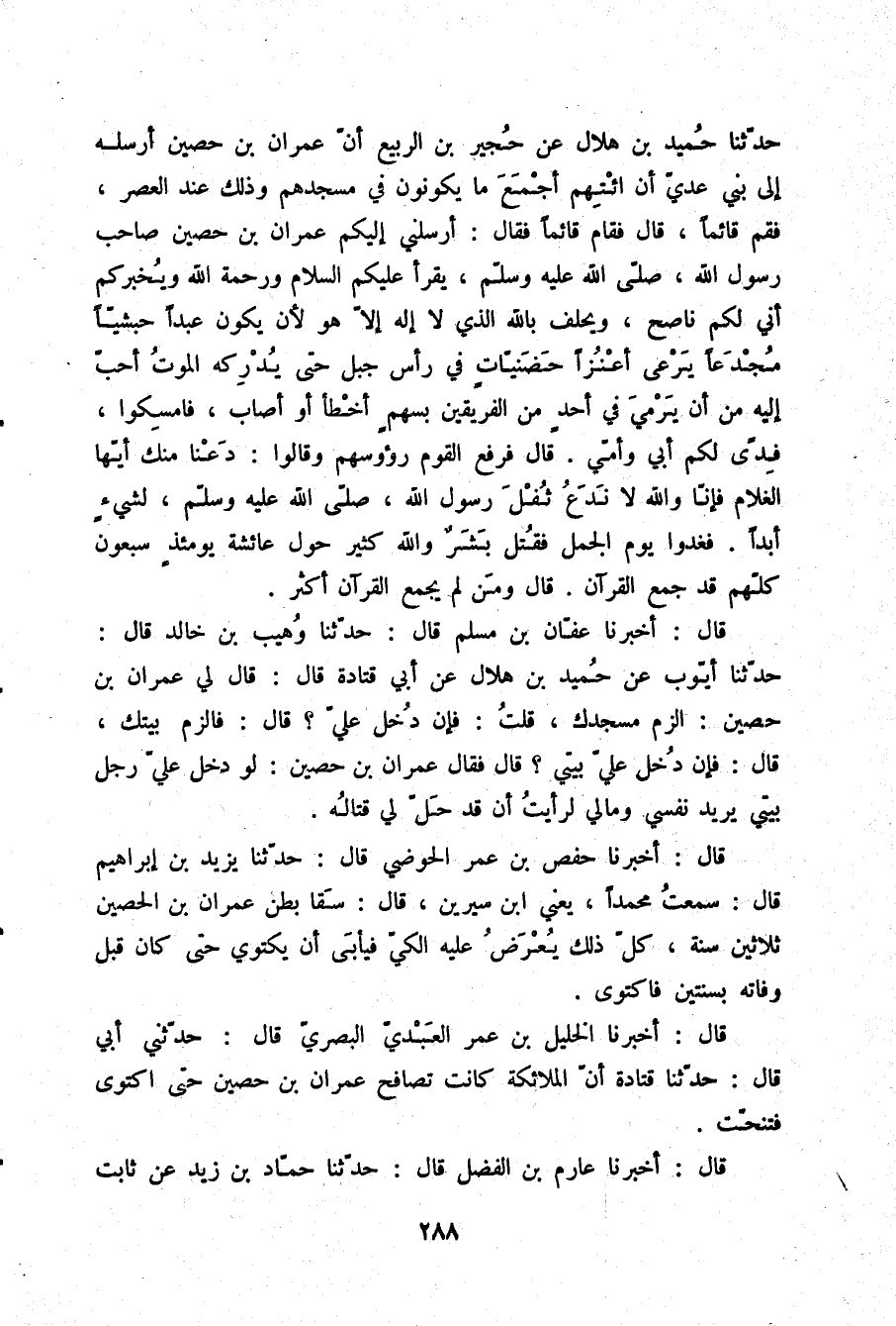 : حَدَّثَنَا حُمَيْدُ بْنُ هِلَالٍ، عَنْ حُجَيْرِ بْنِ الرَّبِيعِ أَنَّ §عِمْرَانَ بْنَ حُصَيْنٍ أَرْسَلَهُ إِلَى بَنِي عَدِيٍّ أَنِ ائْتِهِمْ أَجْمَعَ مَا يَكُونُونَ فِي مَسْجِدِهِمْ وَذَلِكَ عِنْدَ الْعَصْرِ فَقُمْ قَائِمًا قَالَ: فَقَامَ قَائِمًا , فَقَالَ: أَرْسَلَنِي إِلَيْكُمْ عِمْرَانُ بْنُ حُصَيْنٍ صَاحِبُ رَسُولِ اللَّهِ صلّى الله عليه وسلم يَقْرَأُ عَلَيْكُمُ السَّلَامَ وَرَحْمَةَ اللَّهِ وَيُخْبِرُكُمْ أَنِّي لَكُمْ نَاصِحٌ وَيَحْلِفُ بِاللَّهِ الَّذِي لَا إِلَهَ إِلَّا هُوَ لِأَنْ يَكُونَ عَبْدًا حَبَشِيًّا مُجَدَّعًا يَرْعَى أَعْنُزًا حَضَنِيَّاتٍ فِي رَأْسِ جَبَلٍ حَتَّى يُدْرِكَهُ الْمَوْتُ أَحَبَّ إِلَيْهِ مِنْ أَنْ يَرْمِيَ فِي أَحَدٍ مِنَ الْفَرِيقَيْنِ بِسَهْمٍ أَخْطَأَ أَوْ أَصَابَ , فَامْسِكُوا فِدًى لَكُمْ أَبِي وَأُمِّي. قَالَ: فَرَفَعَ الْقَوْمُ رُءُوسَهُمْ , وَقَالُوا: دَعْنَا مِنْكَ أَيُّهَا الْغُلَامُ , فَإِنَّا وَاللَّهِ لَا نَدَعُ ثُفْلَ رَسُولِ اللَّهِ صلّى الله عليه وسلم لِشَيْءٍ أَبَدًا , فَغَدَوْا يَوْمَ الْجَمَلِ , فَقُتِلَ بِشَرٌ وَاللَّهِ كَثِيرٌ حَوْلَ عَائِشَةَ يَوْمَئِذٍ سَبْعُونَ كُلُّهُمْ قَدْ جَمَعَ الْقُرْآنَ، قَالَ: وَمَنْ لَمْ يَجْمَعِ الْقُرْآنَ أَكْثَرُ