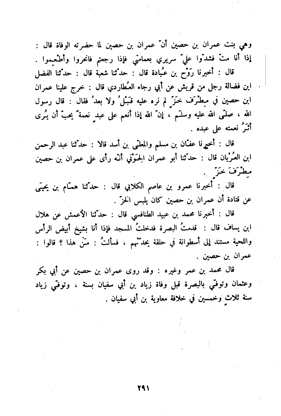 قَالَ: أَخْبَرَنَا مُحَمَّدُ بْنُ عُبَيْدٍ الطَّنَافِسِيُّ قَالَ: حَدَّثَنَا الْأَعْمَشُ، عَنْ هِلَالِ بْنِ يَسَافٍ قَالَ: §قَدِمْتُ الْبَصْرَةَ , فَدَخَلْتُ الْمَسْجِدَ فَإِذَا أَنَا بِشَيْخٍ أَبْيَضَ الرَّأْسِ وَاللِّحْيَةِ مُسْتَنِدٍ إِلَى أُسْطُوَانَةٍ فِي حَلْقَةٍ يُحَدِّثُهُمْ , فَسَأَلْتُ: مَنْ هَذَا؟، قَالُوا: عِمْرَانُ بْنُ حُصَيْنٍ قَالَ مُحَمَّدُ بْنُ عُمَرَ وَغَيْرُهُ: وَقَدْ رَوَى عِمْرَانُ بْنُ حُصَيْنٍ، عَنْ أَبِي بَكْرٍ وَعُثْمَانَ وَتُوُفِّيَ بِالْبَصْرَةِ قَبْلَ وَفَاةِ زِيَادِ بْنِ أَبِي سُفْيَانَ بِسَنَةٍ، وَتُوُفِّيَ زِيَادٌ سَنَةَ ثَلَاثٍ وَخَمْسِينَ فِي خِلَافَةِ مُعَاوِيَةَ بْنِ أَبِي سُفْيَانَ