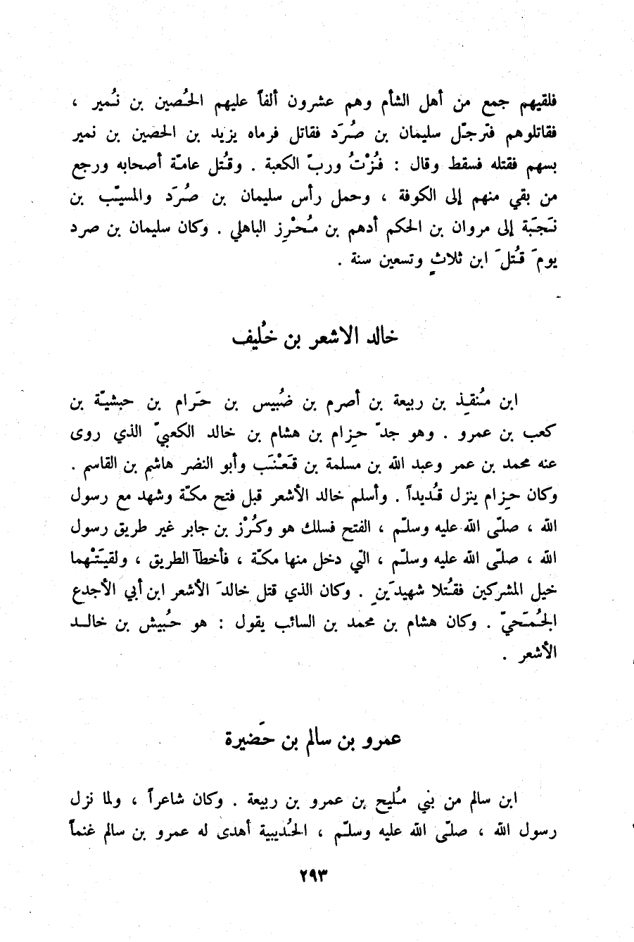 §خَالِدٌ الْأَشْعَرُ بْنُ خُلَيْفِ بْنِ مُنْقِذِ بْنِ رَبِيعَةَ بْنِ أَصْرَمَ بْنِ ضُبَيْسِ بْنِ حَرَامِ بْنِ حَبَشِيَّةَ بْنِ كَعْبِ بْنِ عَمْرٍو وَهُوَ جَدُّ حِزَامِ بْنِ هِشَامِ بْنِ خَالِدٍ الْكَعْبِيِّ الَّذِي رَوَى عَنْهُ مُحَمَّدُ بْنُ عُمَرَ , وَعَبْدُ اللَّهِ بْنُ مَسْلَمَةَ بْنِ قَعْنَبٍ , وَأَبُو النَّضْرِ هَاشِمُ بْنُ الْقَاسِمِ، وَكَانَ حِزَامٌ يَنْزِلُ قُدَيْدًا. وَأَسْلَمَ خَالِدٌ الْأَشْعَرُ قَبْلَ فَتْحِ مَكَّةَ , وَشَهِدَ مَعَ رَسُولِ اللَّهِ صلّى الله عليه وسلم الْفَتْحَ , فَسَلَكَ هُوَ وَكُرْزُ بْنُ جَابِرٍ غَيْرَ طَرِيقِ رَسُولِ اللَّهِ صلّى الله عليه وسلم الَّتِي دَخَلَ مِنْهَا مَكَّةَ فَأَخْطَأَ الطَّرِيقَ وَلَقِيَتْهُمَا خَيْلُ الْمُشْرِكِينَ فَقُتِلَا شَهِيدَيْنِ، وَكَانَ الَّذِي قَتَلَ خَالِدًا الْأَشْعَرَ ابْنُ أَبِي الْأَجْدَعِ الْجُمَحِيُّ، وَكَانَ هِشَامُ بْنُ مُحَمَّدِ بْنِ السَّائِبِ يَقُولُ: هُوَ حُبَيْشُ بْنُ خَالِدٍ الْأَشْعَرُ