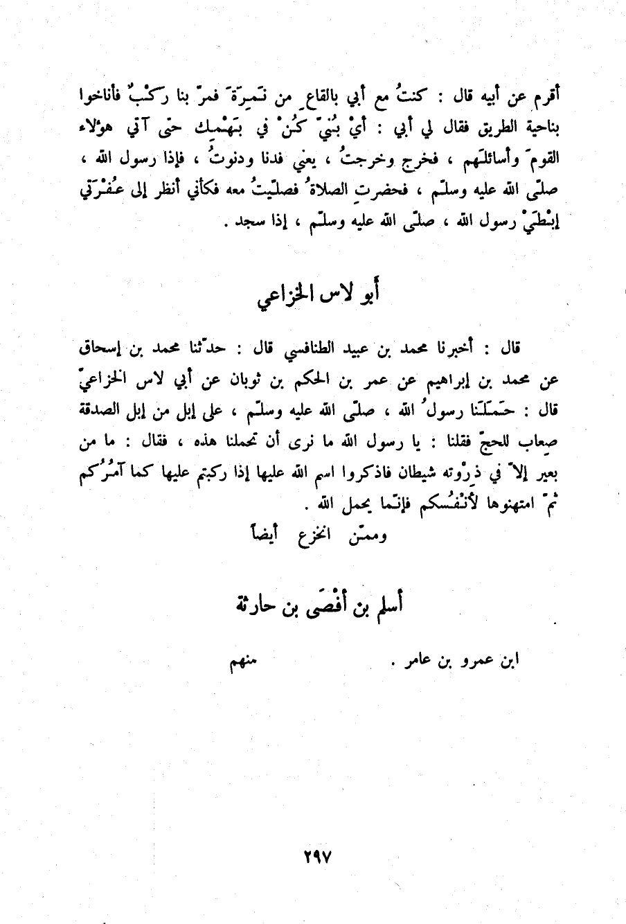 قَالَ: أَخْبَرَنَا مُحَمَّدُ بْنُ عُبَيْدٍ الطَّنَافِسِيُّ قَالَ: حَدَّثَنَا مُحَمَّدُ بْنُ إِسْحَاقَ، عَنْ مُحَمَّدِ بْنِ إِبْرَاهِيمَ، عَنْ عُمَرَ بْنِ الْحَكَمِ بْنِ ثَوْبَانَ، عَنْ أَبِي لَاسٍ الْخُزَاعِيِّ قَالَ: حَمَلَنَا رَسُولُ اللَّهِ صلّى الله عليه وسلم عَلَى إِبِلٍ مِنْ إِبِلِ الصَّدَقَةِ صِعَابٍ لِلْحَجِّ , فَقُلْنَا: يَا رَسُولَ اللَّهِ مَا نَرَى أَنْ تَحْمِلَنَا هَذِهِ، فَقَالَ: «مَا مِنْ §بَعِيرٍ إِلَّا فِي ذُرْوَتِهِ شَيْطَانٌ، فَاذْكُرُوا اسْمَ اللَّهِ عَلَيْهَا إِذَا رَكِبْتُمْ عَلَيْهَا كَمَا آمُرُكُمْ، ثُمَّ امْتَهِنُوهَا لِأَنْفُسِكُمْ فَإِنَّمَا يَحْمِلُ اللَّهُ»