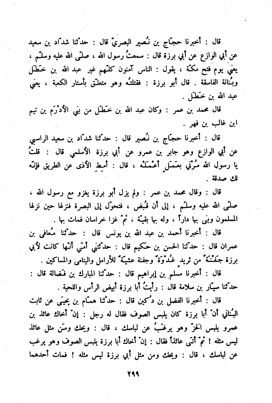 قَالَ: أَخْبَرَنَا حَجَّاجُ بْنُ نُصَيْرٍ الْبَصْرِيُّ قَالَ: حَدَّثَنَا شَدَّادُ بْنُ سَعِيدٍ، عَنْ أَبِي الْوَازِعِ، عَنْ أَبِي بَرْزَةَ قَالَ: سَمِعْتُ رَسُولَ اللَّهِ صلّى الله عليه وسلم - يَعْنِي يَوْمَ فَتْحِ مَكَّةَ - يَقُولُ: «§النَّاسُ آمِنُونَ كُلُّهُمْ غَيْرَ عَبْدِ اللَّهِ بْنِ خَطَلٍ وَبُنَانَةَ الْفَاسِقَةِ» قَالَ أَبُو بَرْزَةَ: فَقَتَلْتُهُ وَهُوَ مُتَعَلِّقٌ بِأَسْتَارِ الْكَعْبَةِ يَعْنِي عَبْدَ اللَّهِ بْنَ خَطَلٍ قَالَ مُحَمَّدُ بْنُ عُمَرَ: وَكَانَ عَبْدُ اللَّهِ بْنُ خَطَلٍ مِنْ بَنِي الْأَدْرَمِ بْنِ تَيْمِ بْنِ غَالِبِ بْنِ فِهْرٍ