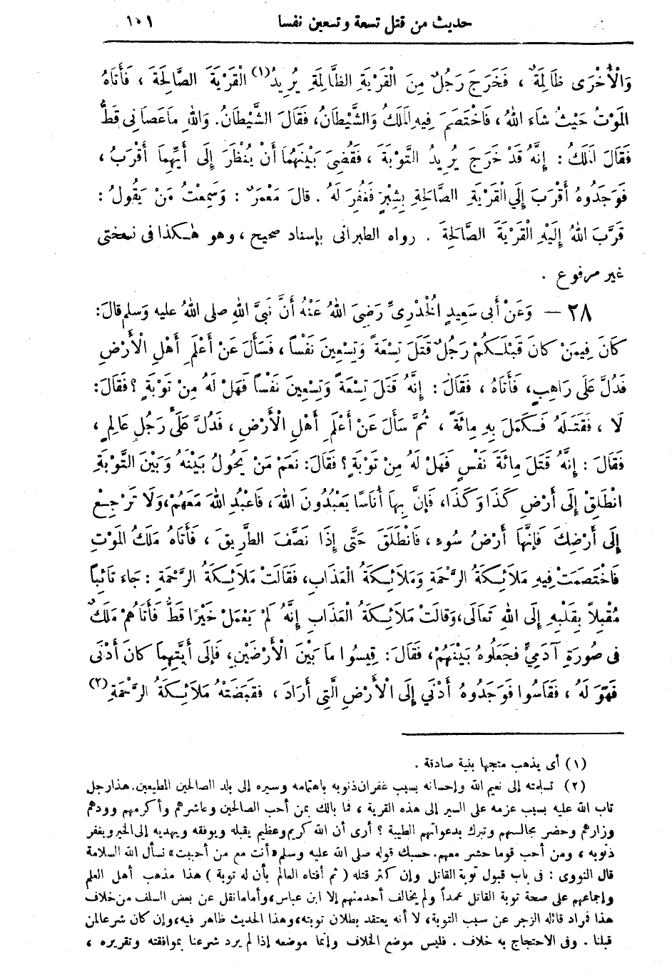 28 - وَعَنْ أَبِي سَعِيدٍ الْخُدْرِيِّ رَضِيَ اللهُ عَنْهُ أَنَّ نَبِيَّ اللهِ صلى اللهُ عليه وسلم قالَ: كَانَ فِيمَنْ كَانَ قَبْلَكَمْ رَجُلٌ قَتَلَ تِسْعَةً وَتِسْعِينَ نَفْساً، فَسَأَلَ عَنْ أَعْلَمِ أَهْلِ الأَرْضِ فَدُلَّ عَلى رَاهِبٍ، فَأَتَاهُ، فَقَالَ: إِنَّهُ قَتَلَ تِسْعَةً وَتِسْعِينَ نَفْساً فَهَلْ لَهُ مِنْ تَوْبَةٍ؟ فَقَالَ: لاَ، فَقَتَلَهُ فَكَمَلَ بِهِ مِائَةً، ثُمَّ سَأَلَ عَنْ أَعْلَمِ أَهْلِ الأَرْضِ، فَدُلَّ عَلَى رَجُلٍ عَالِمٍ، فَقَالَ: إِنَّهُ قَتَلَ مِائَةَ نَفْسٍ فَهَلْ لَهُ مِنْ تَوْبَةِ؟ فَقَالَ: نَعَمْ مَنْ يَحُولُ بَيْنَهُ وَبَيْنَ التَّوْبَةِ. انْطَلِقْ إِلى أَرْضِ كَذَا وَكَذَا، فَإِنَّ بِهَا أُنَاساً يَعْبُدُونَ اللهَ، فاعْبُدِ اللهَ مَعَهُمْ، وَلاَ تَرْجِعْ إِلى أَرْضِكَ فَإِنَّهَا أَرْضُ سُوءٍ، فَانْطَلَقَ حَتَّى إِذَا نَصَّفَ الطَّرِيقَ، فَأَتَاهُ مَلَكُ الْمَوتُ فاخْتَصَمَتْ فِيهِ مَلائِكَةُ الرَّحْمَةِ وَمَلائِكَةُ الْعَذَابِ، فَقَالَتْ مَلائِكَةُ الرَّحْمَةِ: جَاءَ تَائِباً مُقْبلاً بِقَلْبِهِ إِلى اللهِ تَعَالَى، وَقَالَتْ مَلاَئِكَةُ الْعَذَابِ إِنَّهُ لَمْ يَعْمَلْ خَيْراً قَطُّ فَأَتَاهُمْ مَلَكٌ في صُورَةِ آَدَمِيٍّ فَجَعَلُوهُ بَيْنَهُمْ، فَقَالَ: قِيسُوا مَا بَيْنَ الأَرْضَيْنِ، فَإِلى أَيَّتِهِمَا كانَ أَدْنَى فَهُوَ لَهُ، فَقَاسُوا فَوَجَدُوهُ أَدْنَى إِلى الأَرْضِ الَّتِي أَرَادَ، فَقَبَضَتْهُ مَلائِكَةُ الرَّحْمَةِ (¬2).