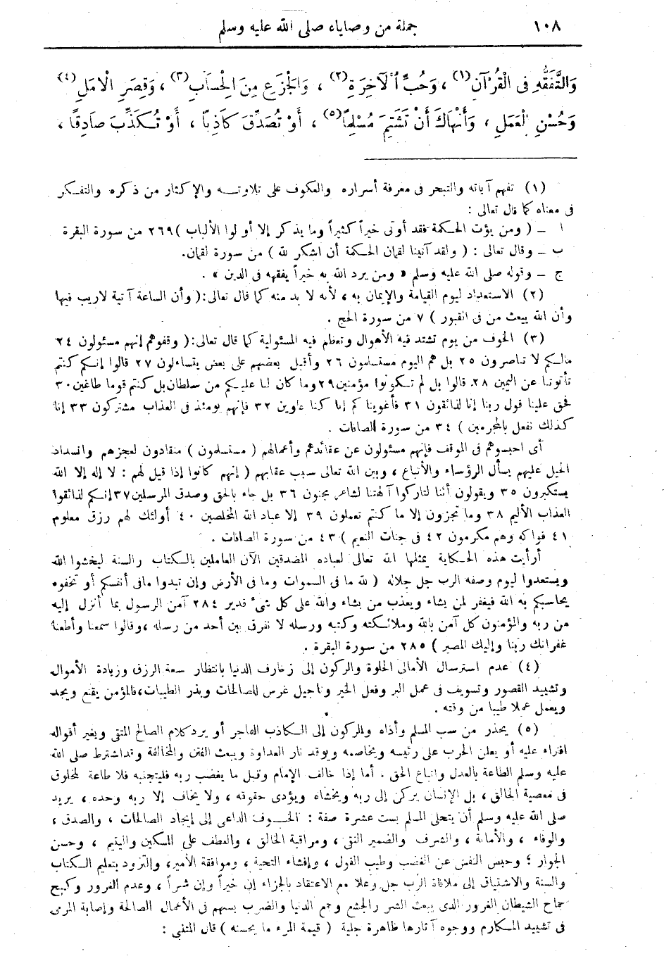 (¬5) يحذر من سب المسلم وأذاه والركون إلى الكاذب الفاجر أو يرد كلام الصالح المتقي ويغير أقواله افتراء عليه أو يعلن الحرب على رئيسه ويخاصمه ويوقد نار العداوة ويبث الفتن والمخالفة وقد اشترط صلى الله عليه وسلم الطاعة بالعدل واتباع الحق. أما إذا خالف الإمام وفعل ما يغضب ربه فليجتنبه فلا طاعة لمخلوق في معصية الخالق، بل الإنسان يركن إلى ربه ويخشاه ويؤدي حقوقه، ولا يخاف إلا ربه وحده، يريد صلى الله عليه وسلم أن يتحلى المسلم بست عشرة صفة: الخوف الداعي إلى إيجاد الصالحات، والصدق، والوفاء، والأمانة، والشرف والضمير النقي، ومراقبة الخالق، والعطف على المسكين واليتيم، وحسن الجوار؛ وحبس النفس عن الغضب وطيب القول، وإفشاء التحية، وموافقة الأمير، والتزود بتعليم الكتاب والسنة والاشتياق إلى ملاقاة الرب جل وعلا مع الاعتقاد بالجزاء إن خيراً وإن شراً، وعدم الغرور وكبح جماح الشيطان الغرور الذي يبعث الشر والجشع وجمع الدنيا والضرب بسهم في الأعمال الصالحة وإصابة المرمى في تشييد المكارم ووجود آثارها ظاهرة جليلة (قيمة المرء ما يحسنه) قال المتنبي: =