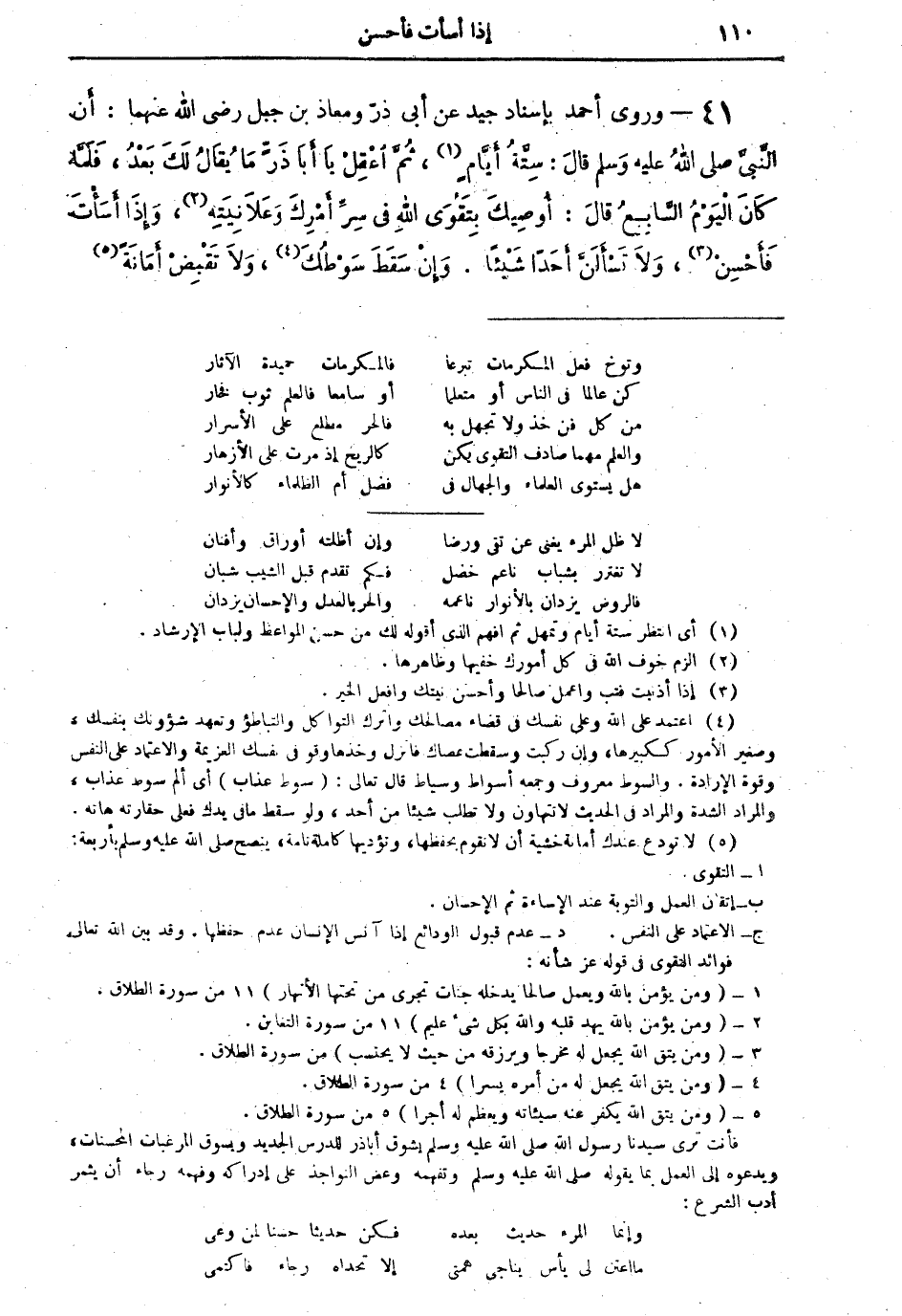 41 - وروى أحمد بإسناد جيد عن أبي ذرّ ومعاذ بن جبل رضي الله عنهما: أَنَّ النبيَّ صلى اللهُ عليه وسلم قالَ: سِتَّةُ أَيَّامٍ (¬1)، ثُمَّ اعْقِلْ يَا أَبَا ذَرٍّ مَا يُقَالَ لَكَ بَعْدُ، فَلَمَّا كَانَ الْيَوْمُ السَّابِعُ قالَ: أُوصِيكَ بِتَقْوَى اللهِ في سِرِّ أَمْرِكَ وَعَلانِيَتِه (¬2)، وَإِذَا أَسَأْتَ فَأَحْسِنْ (¬3)، وَلاَ تَسْأَلَنَّ أَحَداً شَيْئاً، وَإِنْ سَقَطَ سَوْطُكَ (¬4)، وَلاَ تَقْبِضْ أَمَانَةً (¬5).