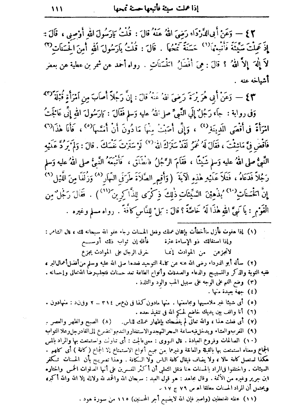 43 - وَعَنْ أَبِي هُرَيْرَةَ رَضِيَ اللهُ عَنْهُ قالَ: إِنَّ رَجُلاً أَصَابَ مِنِ امْرَأَةٍ قُبْلَةً (¬3) وفي رواية: جاءَ رَجُلٌ إِلى النَّبِيِّ صلى اللهُ عليه وسلم فَقَالَ: يَا رَسُولَ اللهِ إِنِّي عَالَجْتُ امْرَأَةً في أَقْصَى الْمَدِينَةِ (¬4)، وَإِنِّي أَصَبْتُ مِنْهَا مَا دُونَ أَنْ أَمَسَّهَا (¬5)، فَأَنا هذَا (¬6) فَاقْضِ فِيَّ مَا شِئْتَ، فَقَالَ لَهُ عُمَرُ لَقَدْ سَتَرَكَ اللهُ (¬7) لَوْ سَتَرْتَ نَفْسَكَ. قال: وَلَمْ يَرُدَّ عَلَيْهِ النبيُّ صلى اللهُ عليه وسلم شيئاً، فَقَامَ فانْطَلَقَ، فَأَتْبَعَهُ النبيُّ صلى اللهُ عليه وسلم رَجُلاً فَدَعَاهُ، فَتَلا عَلَيْهِ هَذِهِ الآيَةَ [وَأَقِمِ الصَّلاَةَ طَرَفَيِ النَّهَارِ (¬8) وَزُلَفاً مِنَ اللَّيْلِ (¬9) إِنَّ الْحَسَناتِ (¬10)