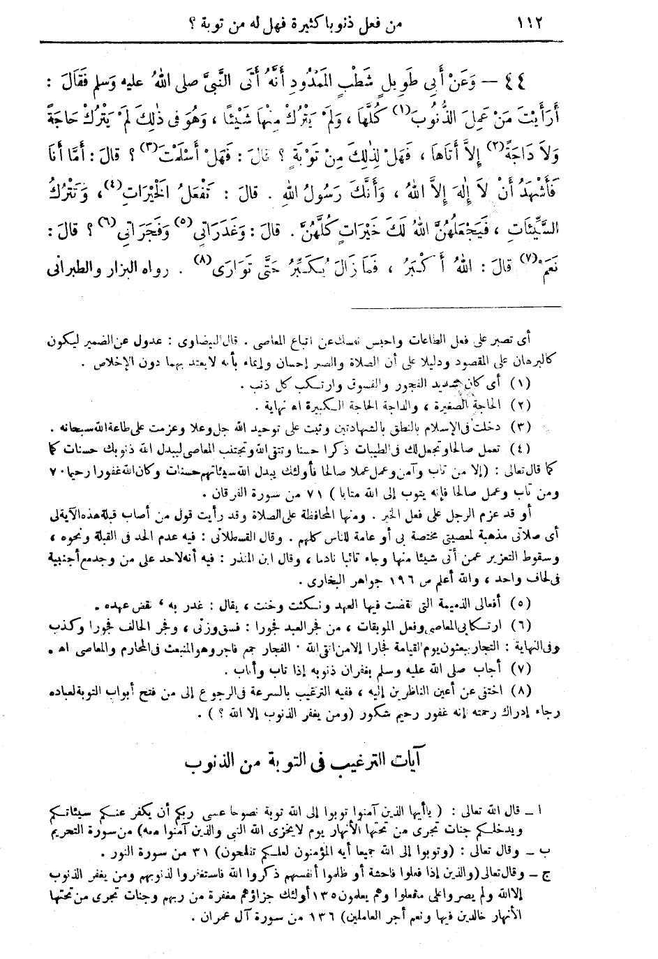 44 - وَعَنْ أَبِي طَوِيلٍ شَطْبٍ الْمَمْدُودِ أَنَّهُ أَتَّى النَّبِيَّ صلى اللهُ عليه وسلم فَقَالَ: أَرَأَيْتَ مَنْ عَمِلَ الذُّنُوبَ (¬1) كُلَّهَا، وَلَمْ يَتْرُكْ مِنْهَا شَيْئَاً، وَهُوَ في ذَلِكَ لَمْ يَتْرُكْ حَاجَةً وَلا دَاجَةً (¬2) إِلاَّ أَتَاهَا، فَهَلْ لِذَلِكَ مِنْ تَوْبَةٍ؟ قالَ: فَهَلْ أَسْلَمْتَ (¬3)؟ قالَ: أَمَّا أَنَا فَأَشْهَدُ أَنْ لا إِله إِلاَّ اللهُ، وَأَنَّكَ رَسُولُ اللهِ. قالَ: تَفْعَلُ الْخَيْرَاتِ (¬4)،