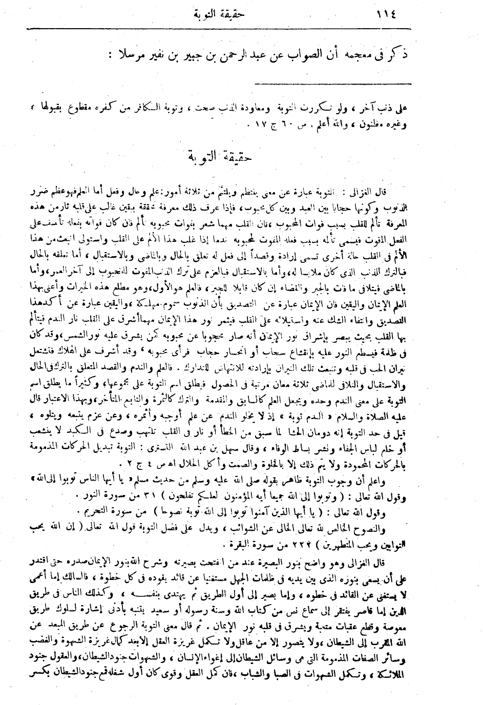 قال الغزالي وهو واضح بنور البصيرة عند من انفتحت بصيرته وشرح الله بنور الإيمان صدره حتى اقتدر على أن يسعى بنوره الذي بين يديه في ظلمات الجهل مستغنياً عن قائد يقوده في كل خطوة، فالسالك إما أعمى لا يستغني عن القائد في خطوه: وإما بصير يهدى إلى أول الطريق ثم يهتدي بنفسه، وكذلك الناس في طريق الدين إما قاصر يفتقر إلى سماع نص من كتاب الله وسنة رسوله أو سعيد يتنبه بأدنى إشارة لسلوك طريق معوصة وقطع عقبات متعبة ويشرق في قلبه نور الإيمان. ثم قال معنى التوبة الرجوع عن الطريق المبعد عن الله المقرب إلى الشيطان، ولا يتصور إلا من عاقل ولا تكمل غريزة العقل إلا بعد كمال غريزة الشهوة والغضب وسائر الصفات المذمومة التي هي وسائل الشيطان إلى إغواء الإنسان، والشهوات جنود الشيطان، والعقول جنود الملائكة، وتكمل الشهوات في الصبا والشباب، فإن كمل العقل وقوي كان أول شغله قمع جنود الشيطان بكسر =
