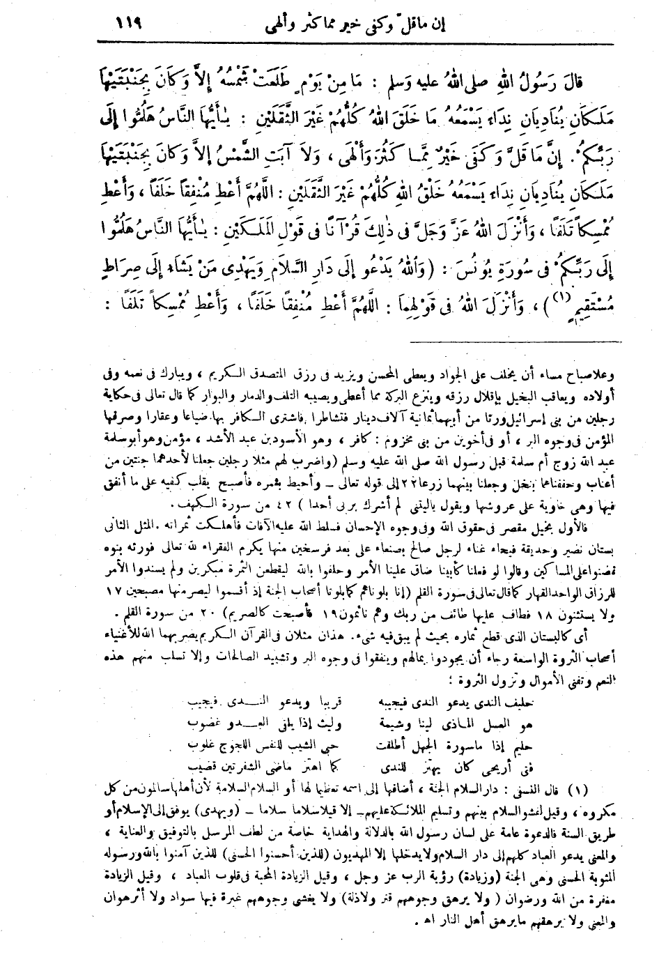 قالَ رَسُولُ اللهِ صلى اللهُ عليه وسلم: مَا مِنْ يَوْمٍ طَلَعَتْ شَمْسُهُ إِلاَّ وَكَانَ بِجَنْبَتَيْهَا مَلَكَانِ يُنَادِيَانِ نِدَاءً يَسْمَعُهُ مَا خَلَقَ كُلُّهُمْ غَيْرَ الثَّقَليْنِ: يَا أَيُّهَا النَّاسُ هَلُمُّوا إِلى رَبِّكُمْ. إِنَّ مَا قَلَّ وَكَفَى خيْرٌ مِمَّا كَثُرَ وَأَلْهَى، وَلا آبَتِ الشَّمْسُ إِلاَّ وَكَانَ بِجَنْبَتَيْهَا مَلَكَانِ يُنَادِيَانِ نِدَاءً يَسْمَعُهُ خَلْقُ اللهِ كُلُّهُمْ غَيْرَ الثَّقَلَيْنِ: اللَّهُمَّ أَعْطِ مُنْفِقاً خَلَفاً، وَأَعْطِ مُمْسِكاً تَلَفاً، وَأَنْزَلَ اللهُ عَزَّ وَجَلَّ في ذلِكَ قُرْآناً في قَوْلِ المَلَكَيْنِ: يَا أَيُّهَا النَّاسُ هَلُمُّوا إِلى رَبِّكُمْ في سُورَةِ يُونُسَ: [واللهُ يَدْعُو إِلى دَارِ السَّلامِ وَيَهْدِي مَنْ يَشَاءُ إِلى صِرَاطٍ مُسْتَقِيمٍ (¬1)]، وَأَنْزَلَ اللهُ في قَوْلِهِمَا: اللَّهُمَّ أَعْطِ مُنْفِقاً خَلَفَا، وَأَعْطِ مُمْسِكَاً تَلَفاً: