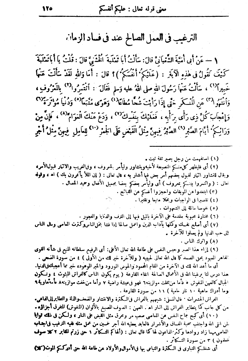 1 - عَنْ أَبِي أُمَيَّةَ الشّعْبَانِيِّ قالَ: سَأَلْتُ أَبَا ثَعْلَبَةَ الخُشَنِيَّ قالَ: قُلْتُ يَا أَبَا ثَعْلَبَةَ كَيْفَ تَقُولُ في هذِهِ الآيَةِ: [عَلَيْكُمْ أَنْفُسَكُمْ]؟ قالَ: أَمَا وَاللهِ لَقَدْ سَأَلْتَ عَنْهَا خَبِيراً (¬1)، سَأَلْتُ عَنْهَا رَسُولَ اللهِ صلى اللهُ عليه وسلم فَقَالَ: ائْتَمِرُوا (¬2) بِالمعْرُوفِ، وانْتَهُوا (¬3) عَنِ الْمُنْكَرِ حَتَّى إِذَا رَأَيْتَ شُحَّاً مُطَاعَاً (¬4) وَهَوىً مُتَّبَعَاً (¬5) وَدُنْيَا مُؤثَرَةً (¬6) وَإِعْجَابَ كُلِّ ذِي رَأْي بِرَأْيِهِ، فَعَلَيْكَ بِنَفْسِكَ (¬7)، وَدَعْ عَنْكَ الْعَوَامَّ (¬8)،