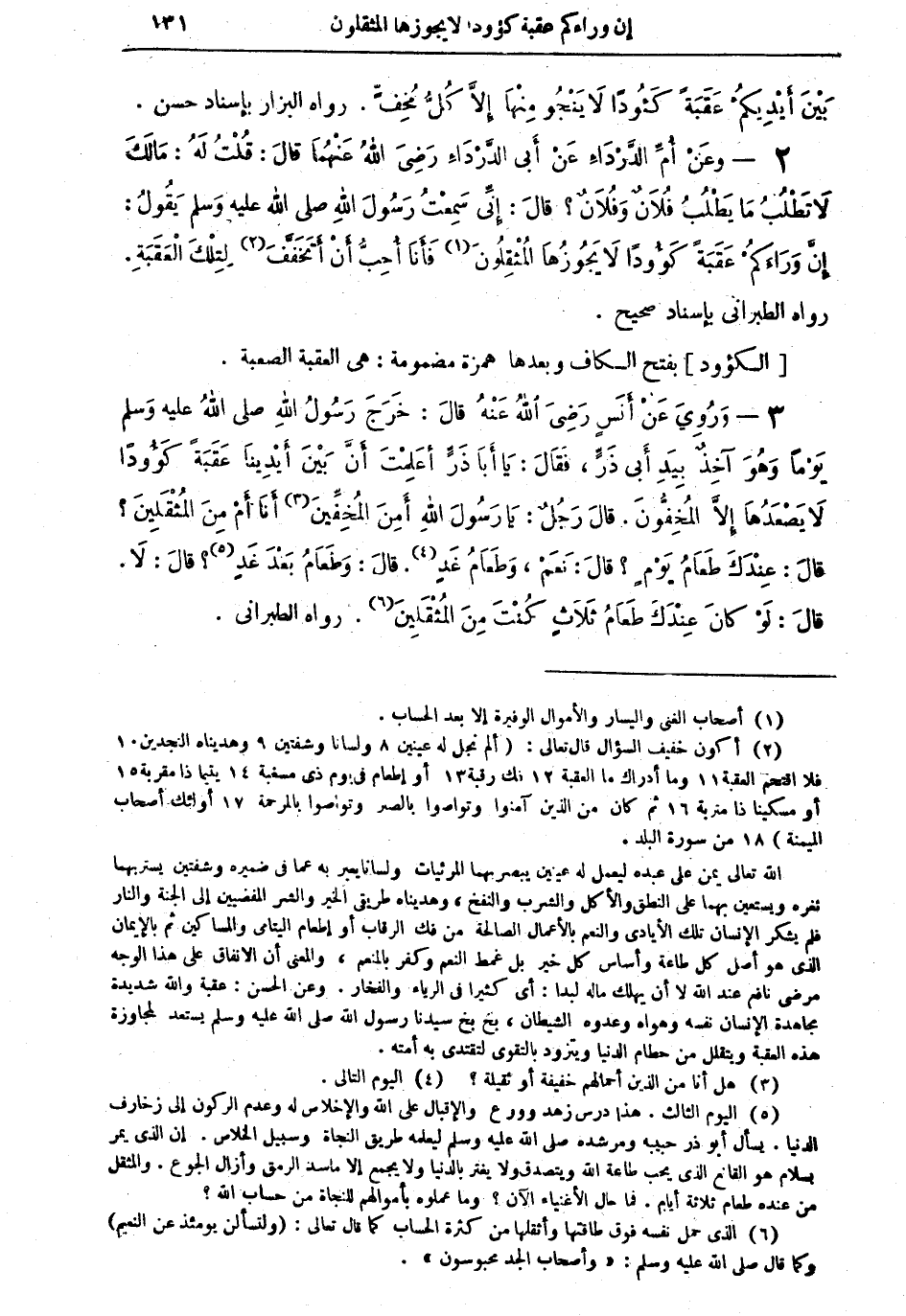 3 - وَرُوِيَ عَنْ أَنَسٍ رَضِيَ اللهُ عَنْهُ قالَ: خَرَجَ رَسُولُ اللهِ صلى اللهُ عليه وسلم يَوْماً وَهُوَ آخِذٌ بِيَدِ أَبِي ذَرٍّ، فَقَالَ: يَا أَبَا ذَرّ: أَعَلِمْتَ أَنَّ بَيْنَ أَيْدِينَا عَقَبَةً كَؤُوداً لا يَصْعَدُهَا إِلاَّ المخِفُّونَ. قالَ رَجُلٌ: يَا رَسُولَ اللهِ أَمِنَ الْمُخِفِّينَ (¬3) أَنَا أَمْ مِنَ الْمُثْقَلِينَ؟ قالَ: عِنْدَكَ طَعَامُ يَوْمٍ؟ قالَ: نَعَمْ، وَطعَامُ غَدٍ (¬4). قالَ: وَطَعَامُ بَعْدَ غَدٍ (¬5)؟ قالَ: لاَ. قالَ: لَوْ كَانَ عِنْدَكَ طَعَامُ ثَلاثٍ كُنْتَ مِنَ الْمُثْقَلِينَ (¬6). رواه الطبراني.