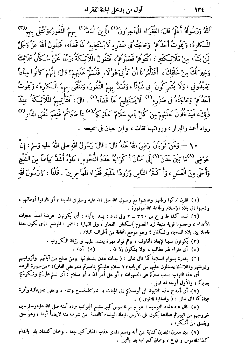 10 - وَعَنْ ثَوْبَانَ رَضِيَ اللهُ عَنْهُ، قال: قالَ رَسُولُ اللهِ صلى اللهُ عليه وسلم: إِنَّ حَوْضِي (¬8) مَا بَيْنَ عَدَن (¬9) إِلى عَمَّانَ أَكْوَابُهُ عَدَدُ النُّجُومِ، مَاؤُهُ أَشَدُّ بَيَاضاً مِنَ الثَّلْج وَأَحْلَى مِنَ الْعَسَلِ، وَأَكْثَرُ النَّاسِ وُرُوداً عَلَيْهِ فُقَرَاءُ المُهَاجِرِينَ. قُلْنَا: يَا رَسُولَ اللهِ
