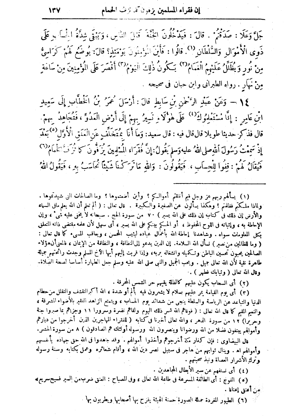 14 - وَعَنْ عَبْدِ الرَّحْمنِ بْنِ سَابِطٍ قالَ: أَرْسَلَ عُمَرُ بْنُ الْخَطَّابِ إِلى سَعِيدِ بْنِ عَامِرٍ: إِنَّا مُسْتَعْمِلُوكَ (¬4) عَلى هَؤلاءِ تَسِيرُ بِهمْ إِلى أَرْضِ الْعَدُوِّ، فَتُجَاهِدُ بِهِمْ. قال فذكر حديثاً طويلاً قال فيه: قال سعيد: وَمَا أَنَا بِمُتَخَلِّفٍ عَنِ الْعَنَقِ الأَوَّلِ (¬5) بَعْدَ إِذْ سَمِعْتُ رَسُولَ اللهِ صلى الله عليه وسلم يَقُولُ: إِنَّ فُقَرَاءَ الْمُسْلِمِينَ يُزَفُّونَ كَمَا تُزَفُّ الْحَمَامُ (¬6) فَيُقَالَ لَهُمْ: قِفُوا لِلْحِسَابِ، فَيَقُولُونَ: وَاللهِ مَا تَرَكْنَا شَيْئاً نُحَاسَبُ بِهِ، فَيَقُولُ اللهُ عَزّ