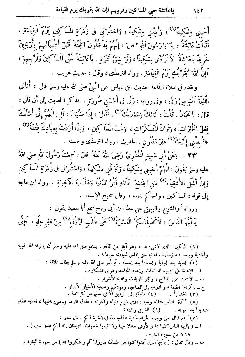 23 - وَعَنْ أَبِي سَعِيدٍ الْخُدْرِيِّ رَضِيَ الله عَنْهُ قالَ: سَمِعْتُ رَسُولَ اللهِ صلى اللهُ عليه وسلم يَقُولُ: اللَّهُمَّ أحْيِنِي مِسْكِيناً، وَتَوَفَّنِي مِسْكِيناً، وَاحْشُرْنِي في زُمْرَةِ المَسَاكِينِ وَإِنَّ أَشْقَى الأَشْقِيَاءِ (¬5) مَنِ اجْتَمَعَ عَلَيْهِ فَقْرُ الدُّنْيَا وَعَذَابُ الآخِرَةِ. رواه ابن ماجة إلى قوله: المساكين، والحاكم بتمامه، وقال صحيح الإسناد.