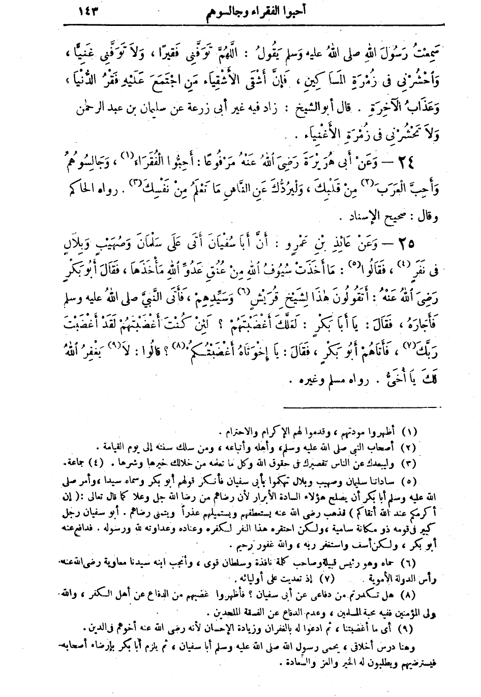 25 - وَعَنْ عَائِذِ بْنِ عَمْرٍو: أَنَّ أَبَا سُفْيَانَ أَتَى عَلَى سَلْمَانَ وَصُهَيْبٍ وَبِلاَلٍ في نَفَرٍ (¬4)، فَقَالُوا (¬5): مَا أَخَذَتْ سُيُوفُ اللهِ مِنْ عُنُقِ عَدُوِّ اللهِ مَأْخَذَهَا، فَقَالَ أَبُو بَكْرٍ رَضِيَ اللهُ عَنْهُ: أَتَقُولُونَ هذَا لِشَيْخِ قُرَيْشٍ (¬6) وَسَيِّدِهِمْ، فَأَتَى النَّبِيَّ صلى الله عليه وسلم فَأَجَارَهُ، فَقَالَ: يَا أَبَا بَكْرٍ: لَعَلَّكَ أَغْضَبْتَهُمْ؟ لَئِنْ كُنْتَ أَغْضَبْتَهُمْ لَقَدْ أَغَضَبْتَ رَبَّكَ (¬7)، فَأَتَاهُمْ أَبُو بَكْرٍ، فَقَالَ: يَا إِخْوَتَاهُ أَغْضَبْتُكُمْ (¬8)؟ قَالُوا: لاَ (¬9) يَغْفِرُ اللهُ لَكَ يَا أُخَيُّ. رواه مسلم وغيره.