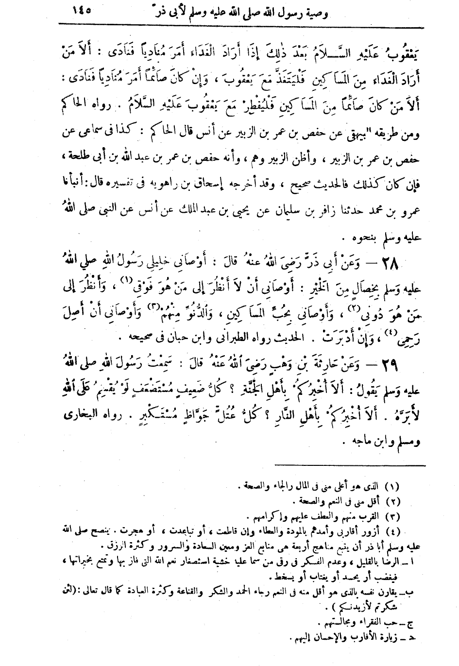28 - وَعَنْ أَبِي ذَرٍّ رَضِيَ اللهُ عَنْهُ قالَ: أَوْصَانِي خَلِيلِي رَسُولُ اللهِ صلى اللهُ عليه وسلم بِخِصَالٍ مِنَ الْخَيْرِ: أَوْصَانِي أَنْ لا أَنْظُرَ إِلى مَنْ هُوَ فَوْقِي (¬1)، وَأَنْظُرَ إِلى مَنْ هُوَ دُونِي (¬2)، وَأَوْصَانِي بِحُبِّ الْمَسَاكِينِ، وَالدُّنُوِّ مِنْهُمْ (¬3) وَأَوْصَانِي أَنْ أَصِلَ رَحِمِي (¬4)،