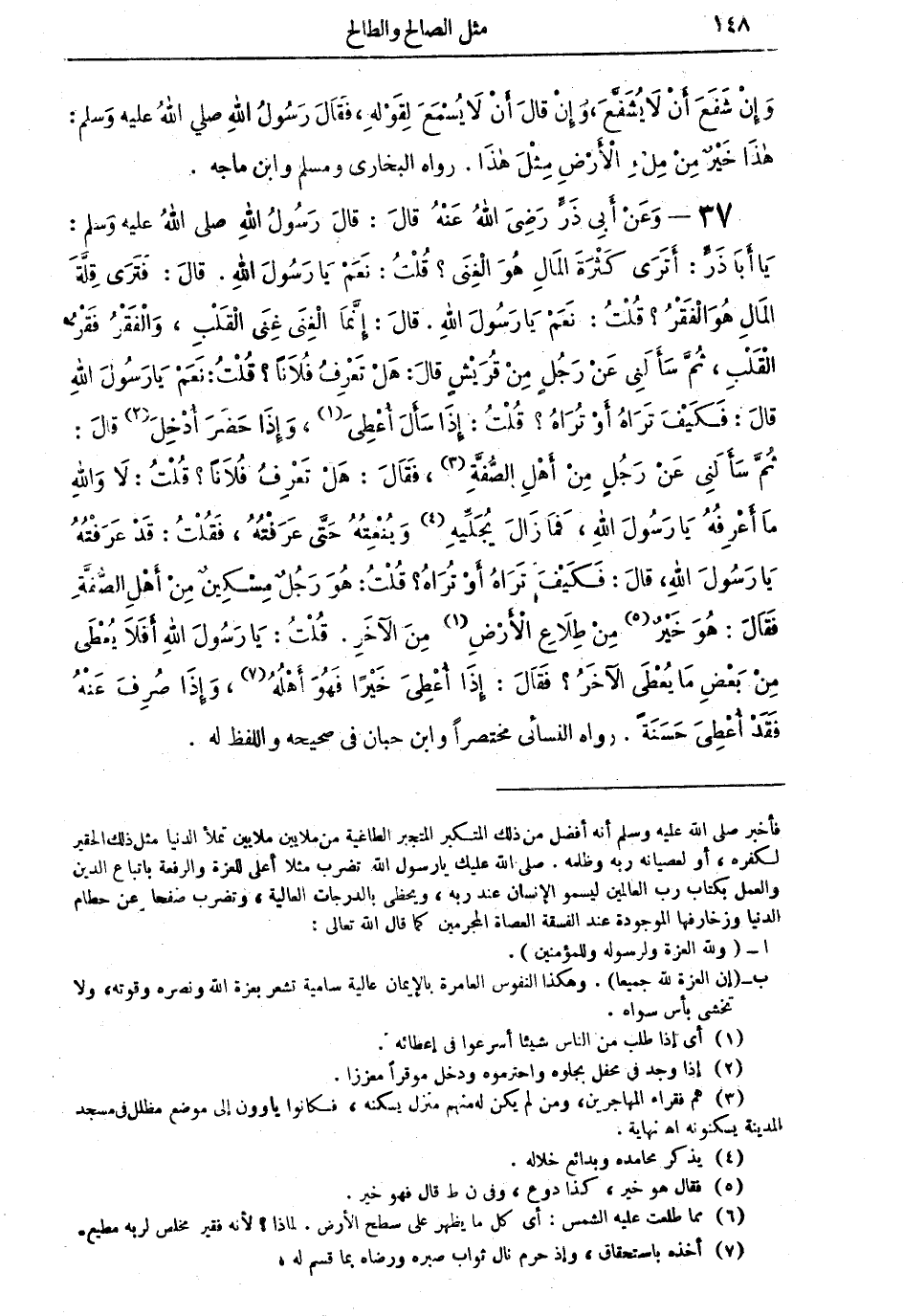 37 - وَعَنْ أَبِي ذَرٍّ رَضِيَ اللهُ عَنْهُ قالَ: قالَ رَسُولُ اللهِ صلى اللهُ عليه وسلم: يَا أَبَا ذَرٍّ: أَتَرَى كَثْرَةَ الْمَالِ هُوَ الْغَنَى؟ قُلْتُ: نَعَمْ يَا رَسُولَ اللهِ. قالَ: فَتَرَى قِلَّةَ الْمَالِ هُوَ الْفَقْرُ؟ قُلْتُ: نَعَمْ يَا رَسُولَ اللهِ. قالَ: إِنَّمَا الْغِنَى غِنَى الْقَلْبِ، والْفَقْرُ فَقْرُ الْقَلْبِ، ثُمَّ سَأَلَنِي عَنْ رَجُلٍ مِنْ قُرَيْشٍ قالَ: هَلْ تَعْرِفُ فُلاَناً؟ قُلْتُ: نَعَمْ يَا رَسُولَ اللهِ. قالَ: فَكَيْفَ تَرَاهُ أَوْ تُرَاهُ. قُلْتُ: إِذَا سَأَلَ أُعْطِي (¬1)، وَإِذَا حَضَرَ أُدْخِل (¬2). قالَ: ثُمَّ سَأَلَنِي عَنْ رَجُلٍ مِنْ أَهْلِ الصُّفَّةِ (¬3)، فَقَالَ: هَلْ تَعْرِفُ فُلاناً؟ قُلْتُ: لاَ وَاللهِ مَا أَعْرِفُهُ يَا رَسُولَ اللهِ، فَمَا زَالَ يُجَلِّيهِ (¬4) وَيُنْعِتُهُ حَتَّى عَرَفْتُهُ، فَقُلْتُ: قَدْ عَرَفْتُهُ يَا رَسُولَ اللهِ، قالَ: فَكَيْفَ تَرَاهُ أَوْ تُرَاهُ؟ قُلْتُ: هُوَ رَجُلٌ مِسْكِينٌ مِنْ أَهْلِ الصُّفَّةِ. فَقَالَ: هُوَ خَيْرٌ (¬5) مِنْ طِلاعِ الأَرْضِ (¬6) مِنَ الآخَرِ.