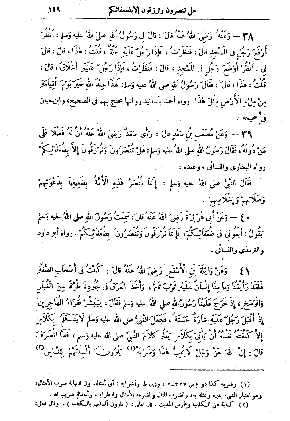 40 - وَعَنْ أَبِي هُرَيْرَةَ رَضِيَ اللهُ عَنْهُ قالَ: سَمِعْتُ رَسُولَ اللهِ صلى اللهُ عليه وسلم يَقُولُ: ابْغُونِي في ضُعَفَائِكُمْ، فَإِنَّمَا تُرْزَقُونَ وَتُنْصَرُونَ بِضُعَفَائِكُمْ. رواه أبو داود والترمذي والنسائي.