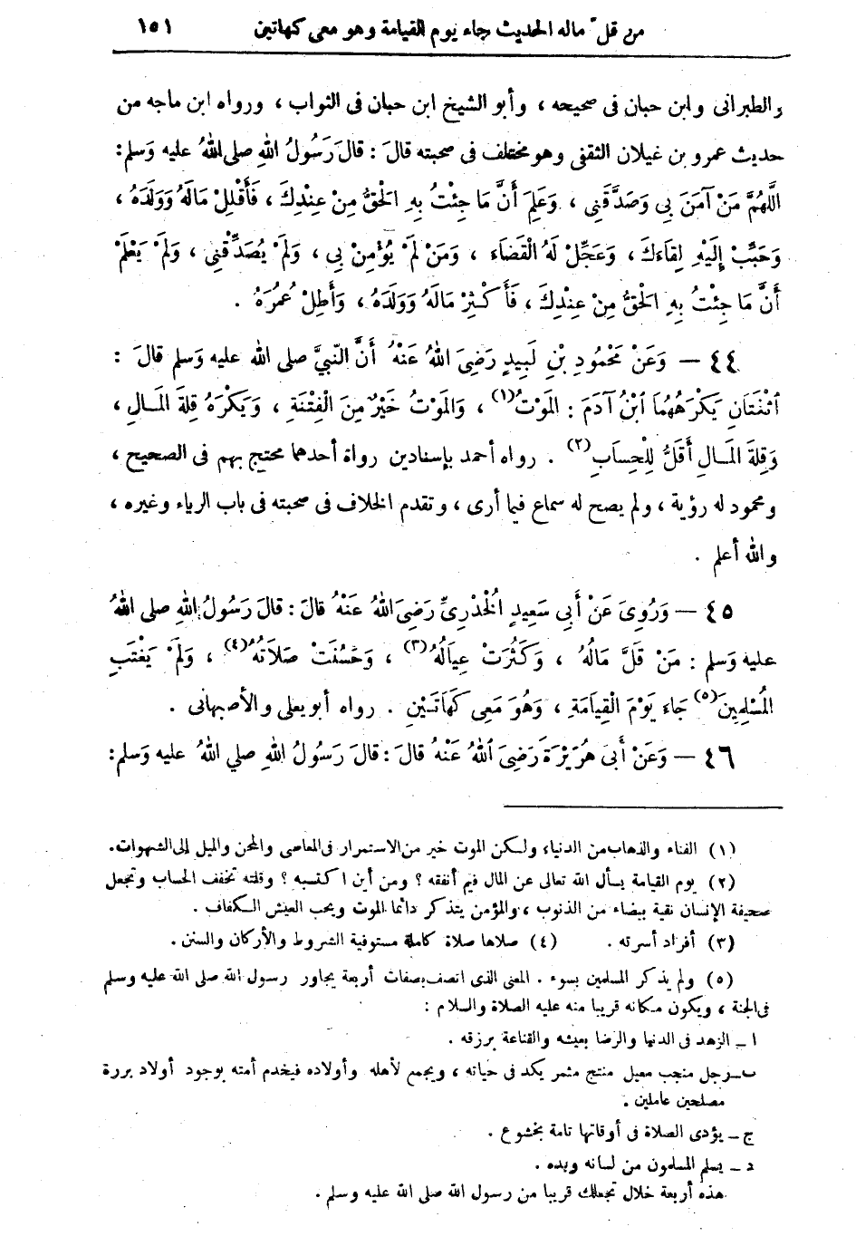 44 - وَعَن مَحْمُودِ بْنِ لَبِيدٍ رَضِيَ اللهُ عَنْهُ أَنَّ النَّبِيَّ صَلى اللهُ عليه وسلم قالَ: اثْنَتَانِ يَكْرَهُهُمَا ابْنُ آدَمَ: الْمَوْتُ (¬1)، وَالْمَوْتُ خَيْرٌ مِنَ الْفِتْنَةِ، وَيَكْرَهُ قِلَّةَ المالِ، وَقِلَّةُ الْمَالِ أَقَلُّ لِلْحِسَابِ (¬2). رواه أحمد بإسنادين رواة أحدهما محتج بهم في الصحيح، ومحمود له رؤية، ولم يصح له سماع فيما أرى، وتقدم الخلاف في صحبته في باب الرياء وغيره، والله أعلم.