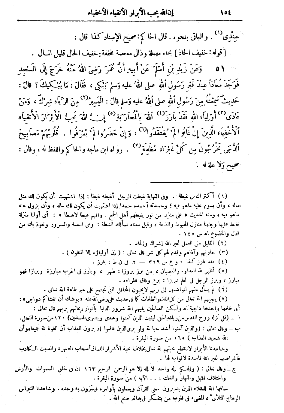 51 - وَعَنْ زَيْدِ بْنِ أَسْلَمَ عَنْ أَبِيهِ أَنَّ عُمَرَ رَضِيَ اللهُ عَنْهُ خَرَجَ إِلى الْمَسْجِدِ فَوَجَدَ مُعاذَاً عِنْدَ قَبْرِ رَسُولِ اللهِ صلى اللهُ عليه وسلم يَبْكِي، فقَالَ: مَا يُبْكِيكَ؟ قالَ: حَدِيثٌ سَمِعْتُهُ مِنْ رَسُولِ اللهِ صلى اللهُ عليه وسلم قالَ: الْيَسِيرُ (¬2) مِنَ الرِّيَاءِ شِرْكٌ، وَمَنْ عَادَى (¬3) أَوْلِيَاءَ اللهِ فَقَدْ بَارَزَ (¬4) اللهَ بِالْمُحَارَبَةِ (¬5) إِنَّ اللهَ يُحِبُّ الأَبْرَارَ الأَتْقِياءَ الأَخْفِياءَ الَّذِينَ إِنْ غَابُوا لَمْ يُفْتَقَدُوا (¬6)، وَإِنْ حَضَرُوا لَمْ يُعْرَفُوا. قُلُوبُهُمْ مَصَابِيحُ الدُّجَى يَخْرُجُونَ مِنْ كلِّ غَبْرَاءَ مُظْلِمَةٍ (¬7).