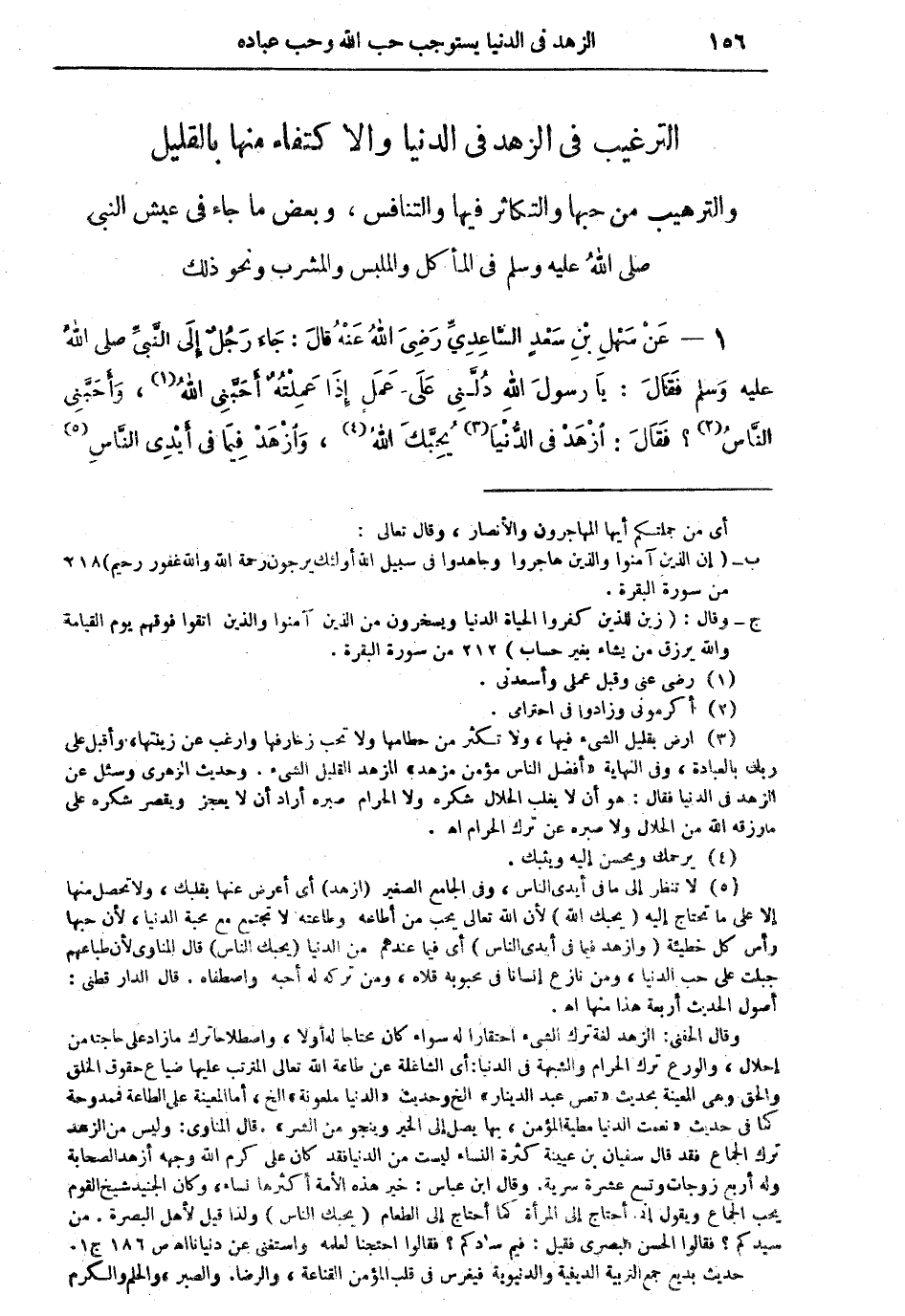 (¬3) ارض بقليل الشيء فيها، ولا تكثر من حطامها ولا تحب زخارفها وارغب عن زينتها، وأقبل على ربك بالعبادة، وفي النهاية "أفضل الناس مؤمن مزهد" المزهد القليل الشيء. وحديث الزهري وسئل عن الزهد في الدنيا فقال: هو أن لا يغلب الحلال شكره ولا الحرام صبره أراد أن لا يعجز ويقصر شكره على ما رزقه الله من الحلال ولا صبره عن ترك الحرام أهـ.
