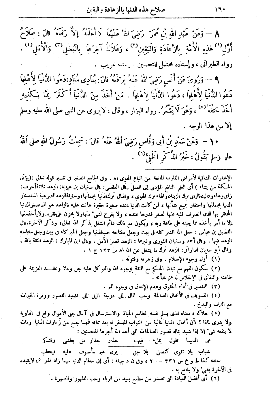 = الإشارات الشافية لأمراض القلوب المانعة من اتباع الهوى أهـ. وفي الجامع الصغير في تفسير قوله تعالى: [يؤتي الحكمة من يشاء] أي العلم النافع المؤدي إلى العمل. قال العلقمي قال سفيان بن عيينة: الزهد ثلاثة أحرف: زاي وهاء ودال، فالزاي ترك الزينة، والهاء ترك الهوى والدال ترك الدنيا بجملتها، وحقيقة الزهد الشرعية استصغار الدنيا بجملتها واحتقار جميع شأنها، فمن كانت الدنيا عنده صغيرة حقيرة هانت عليه فالزاهد هو المستصغر للدنيا المحتقر بها الذي انصرف قلبه عنها لصغر قدرها عنه، ولا يفرح لشيء منها ولا يحزن على فقده، ولا يأخذ منها إلا ما أمر بأخذه مما يعينه على طاعة ربه، ويكون مع ذلك دائم الشغل بذكر الله تعالى، وذكر الآخرة. قال الفضيل بن عياض: جعل الله الشر كله في بيت وجعل مفتاحه حب الدنيا وجعل الخير كله في بيت وجعل مفتاحه الزهد فيها، وقال أحمد وسفيان الثوري وغيرهما: الزهد قصر الأمل، وقال ابن المبارك: الزهد الثقة بالله، وقال أبو سليمان الداراني: الزهد ترك ما يشغل عن الله أهـ ص 123 جـ 1.